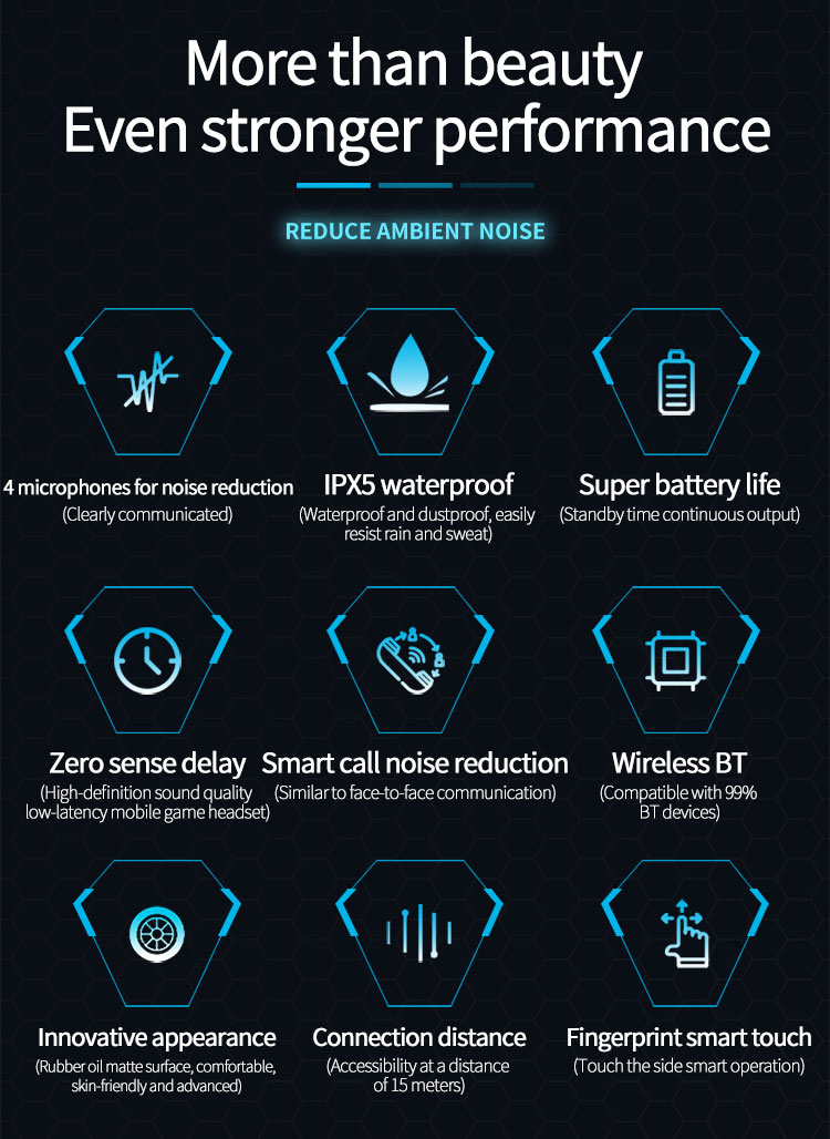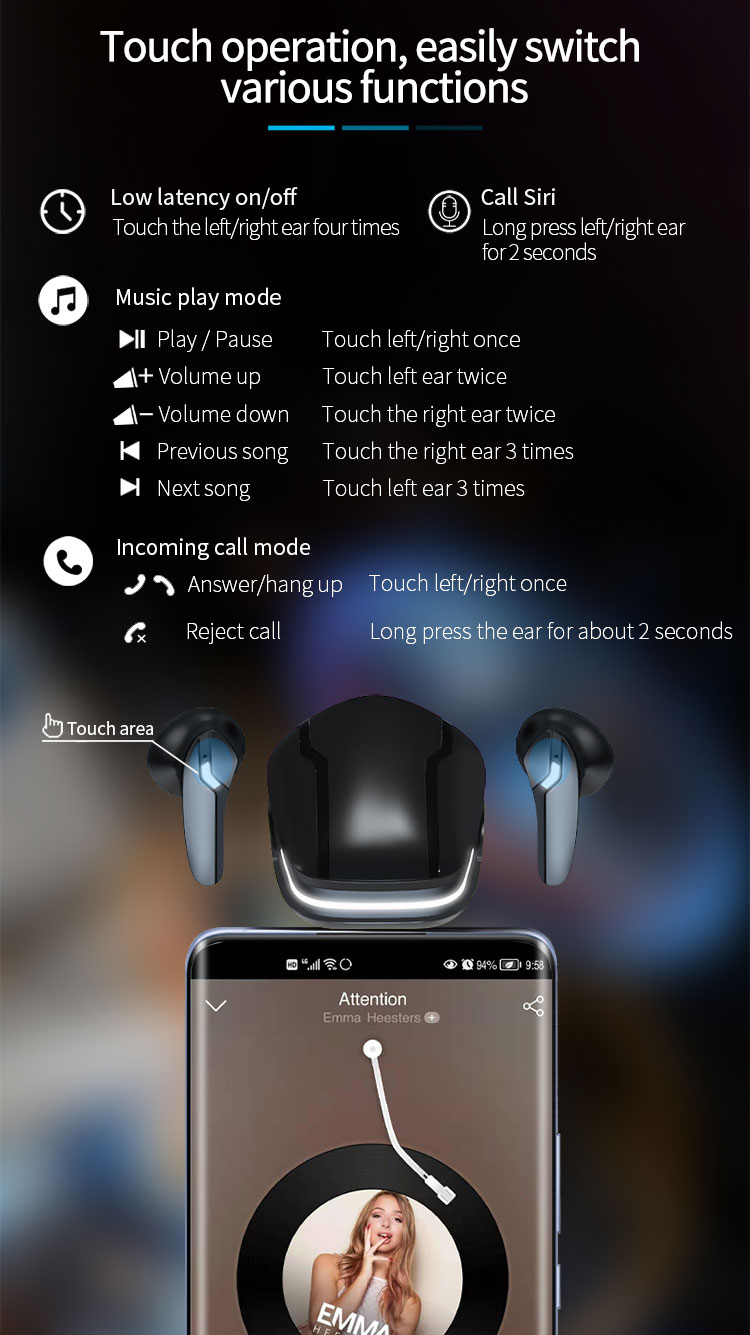 Feature | Jieli 6976 chip / True stereo, double mark ENC noise reduction / clearer call / game low delay / touch control / LED light full esports outer shell frosted texture Function:Touch / switch / pause / answer a call / volume up / down / Siri |