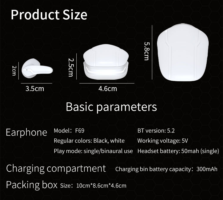Specification | BT 5.2 Battery capacity:earphone 35mAh & Charge warehouse300mAh trumpet:13mm effective range: ≥10M Music time: ≥4hrs stand-by time:15days charging time: earphone ≤1 hrs & Charge warehouse: ≤2hrs voice tone: support battery status:support shell material: ABS Waterproof grade; ipx5 product color:white black |