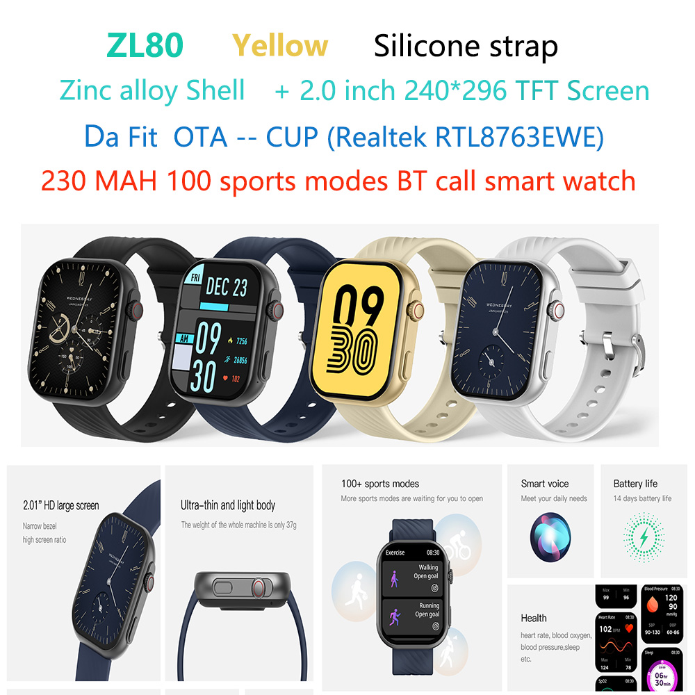 ZL80 Zinc alloy Shell 2.0 inch Square TFT screen CPU (RTL8763EWE) 230 MAH AI voice assistant 100 sports modes BT call phone smart watch |