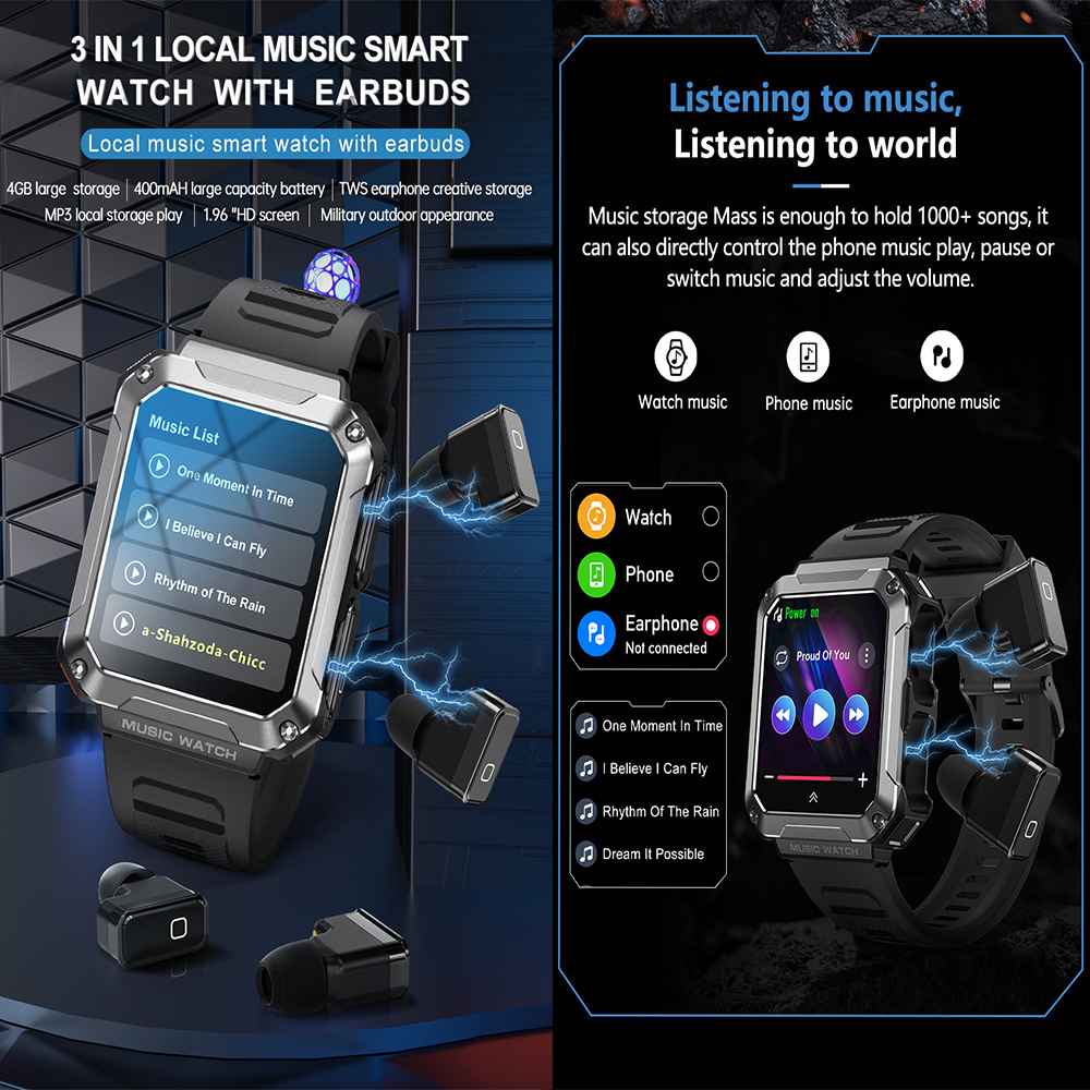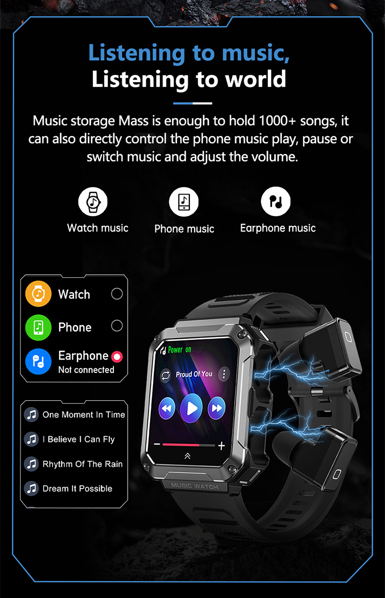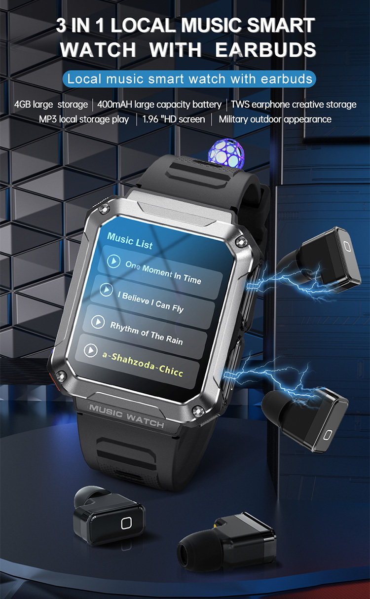 The watch comes with 4GB of internal memory (up to 32GB customizable), which can store up to 1200+songs for local playback, and can play for up to 10 hours of powerful sound effects (maximum volume). The recording can support up to 75 hours.