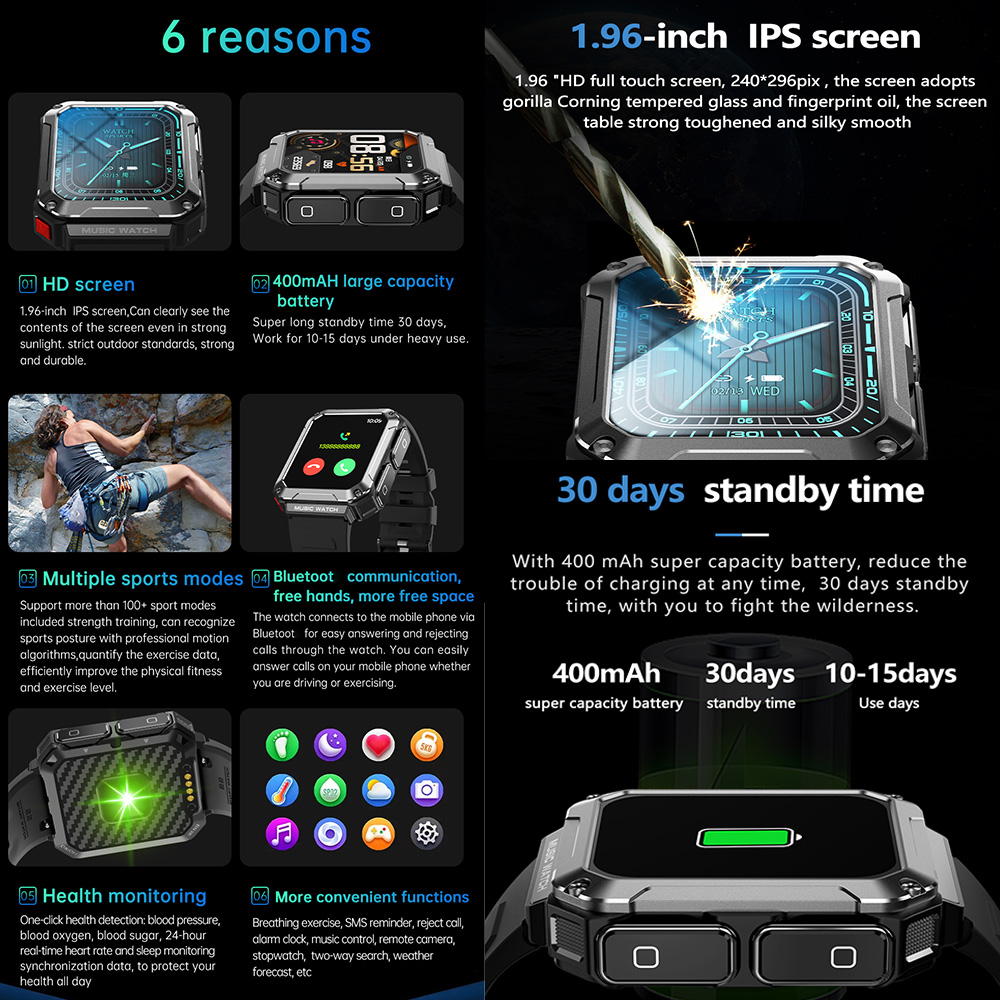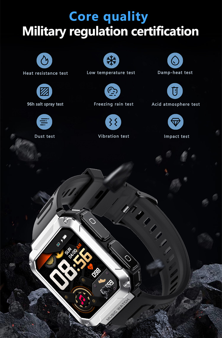 Selling point (smart watch part) | Three defense appearance, metal craftsmanship, Zinc alloy + plastic polyethylene material ,TPU high-end high-end sports style watch strap,
