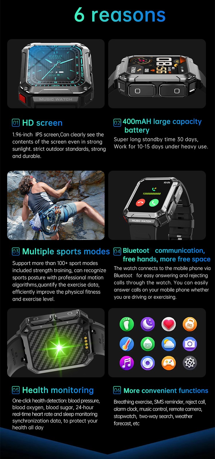 100+sport mode, massive free dial download and DIY dial production. |