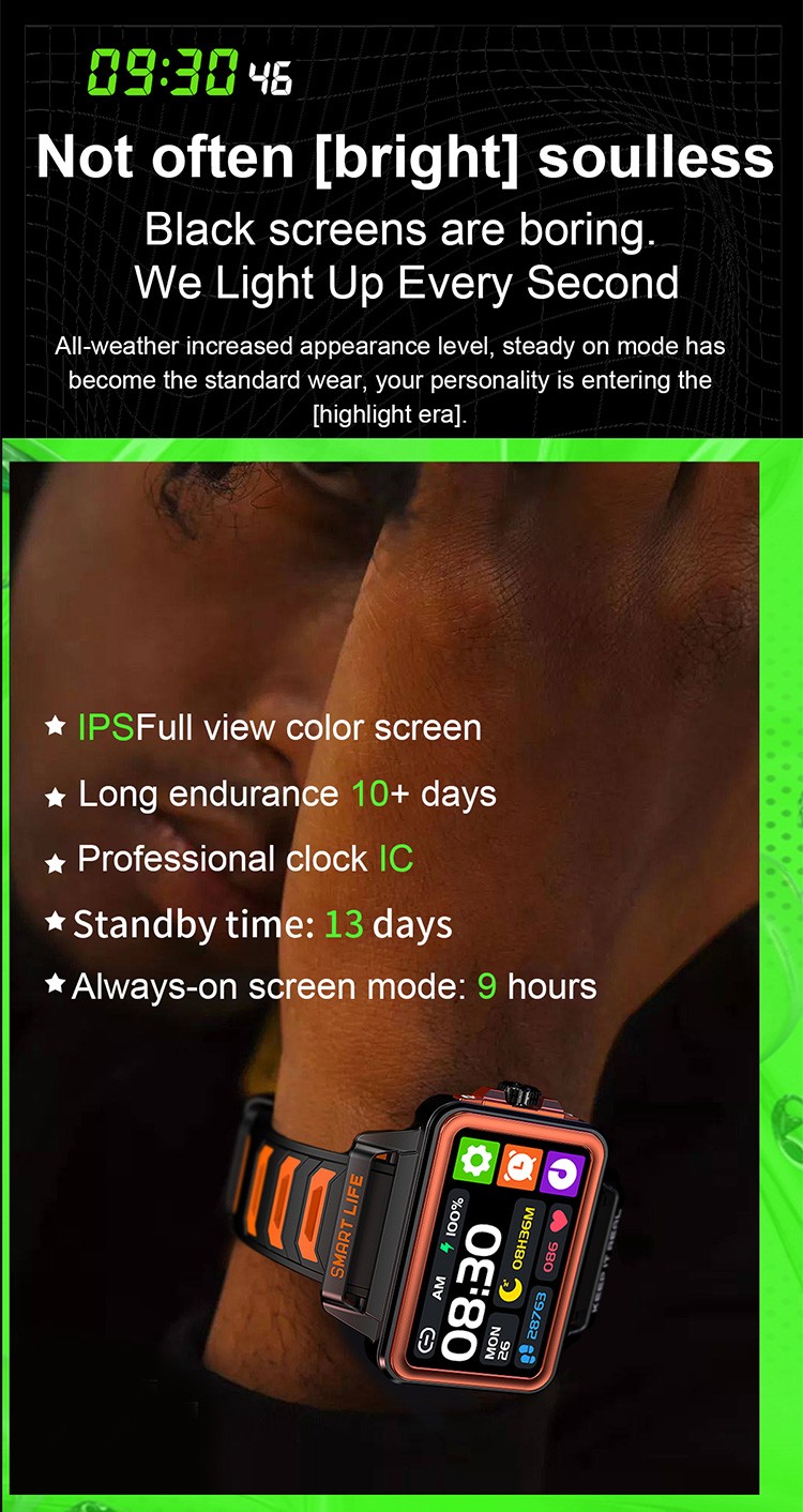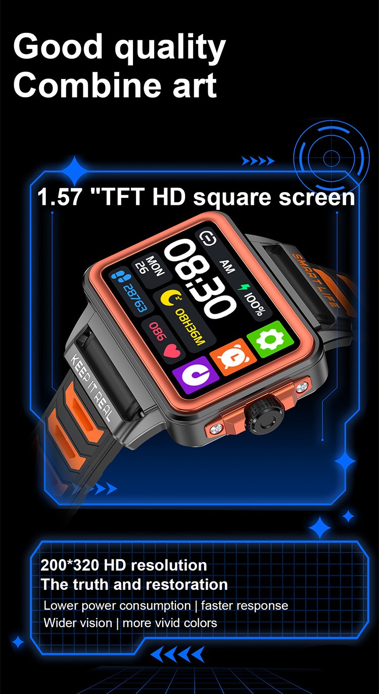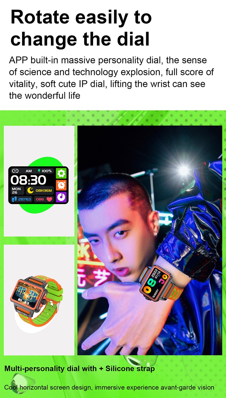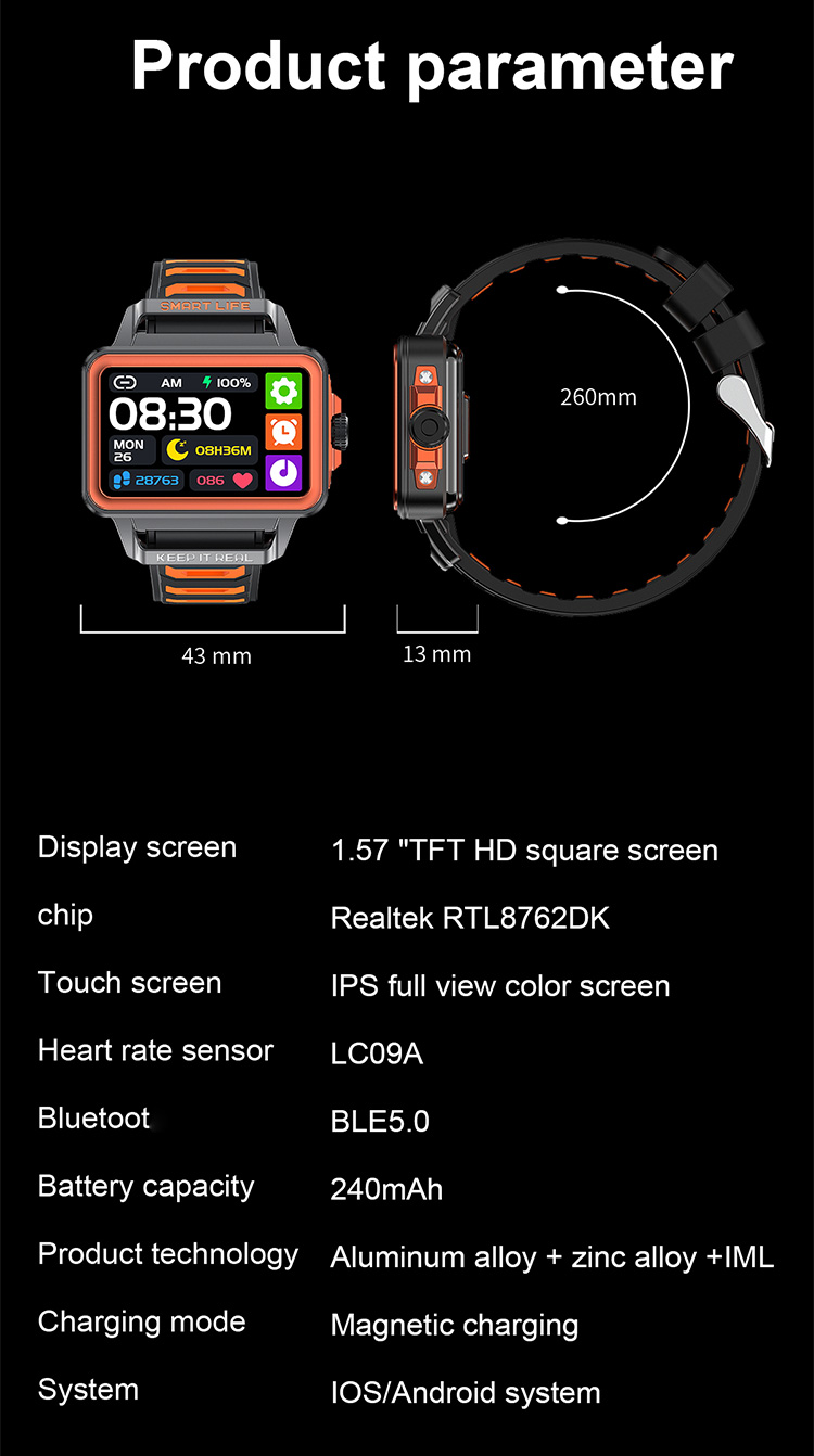 Function | 1.Built-in professional clock IC, no mobile phone connection, the watch clock normal use; 2.Will not appear ordinary smartwatch time is not allowed; 3. Picture reminder (drinking water, weight loss, medication, etc. with a picture reminder) step counting, brightness adjustment, sleep detection, heart rate, information push, remote control music, remote control photo, alarm clock, torch, lift the hand to light up the screen |