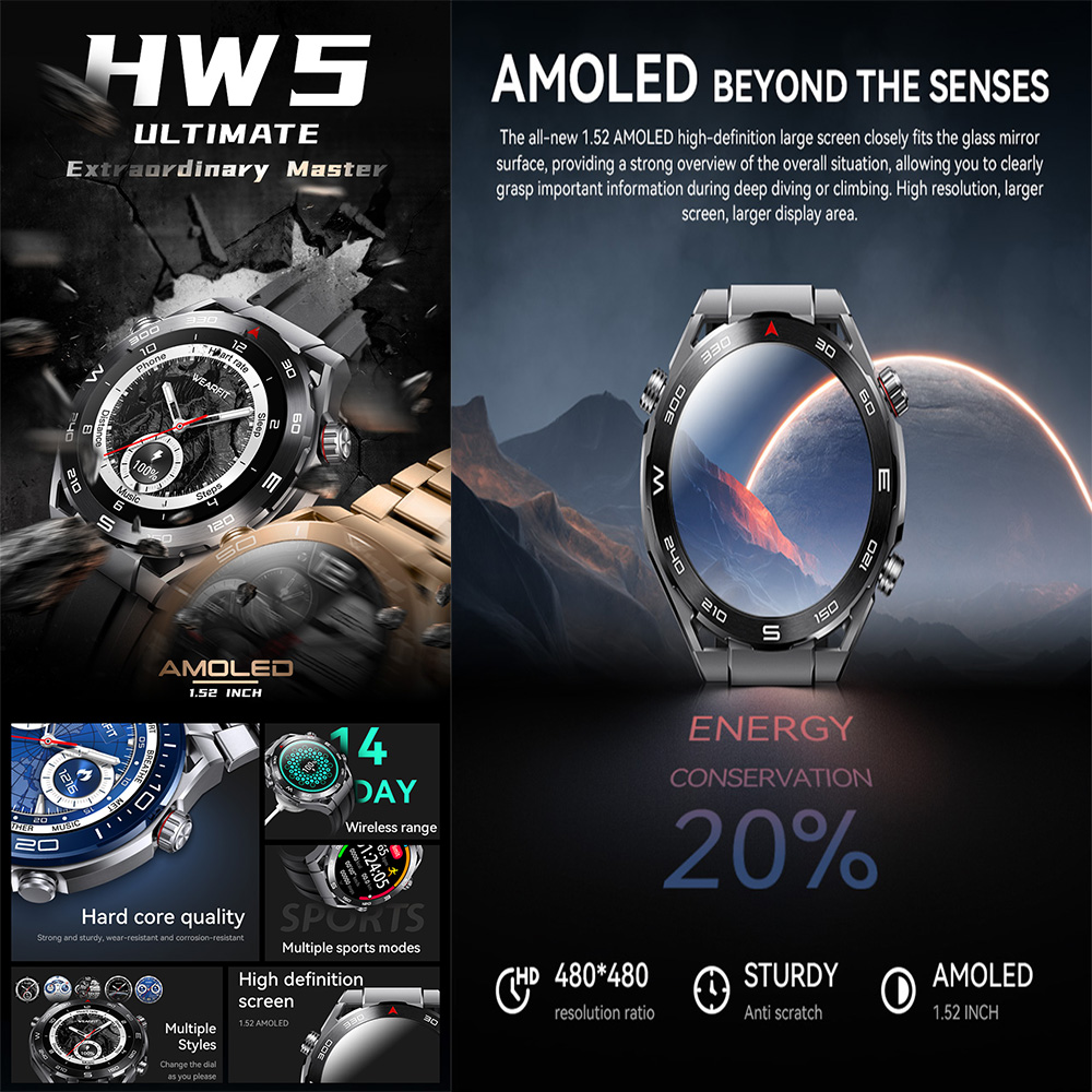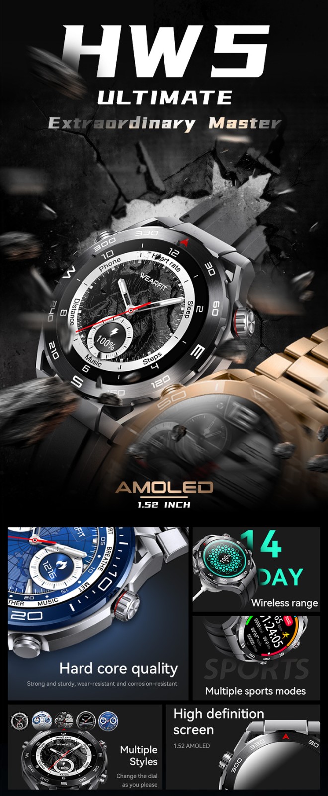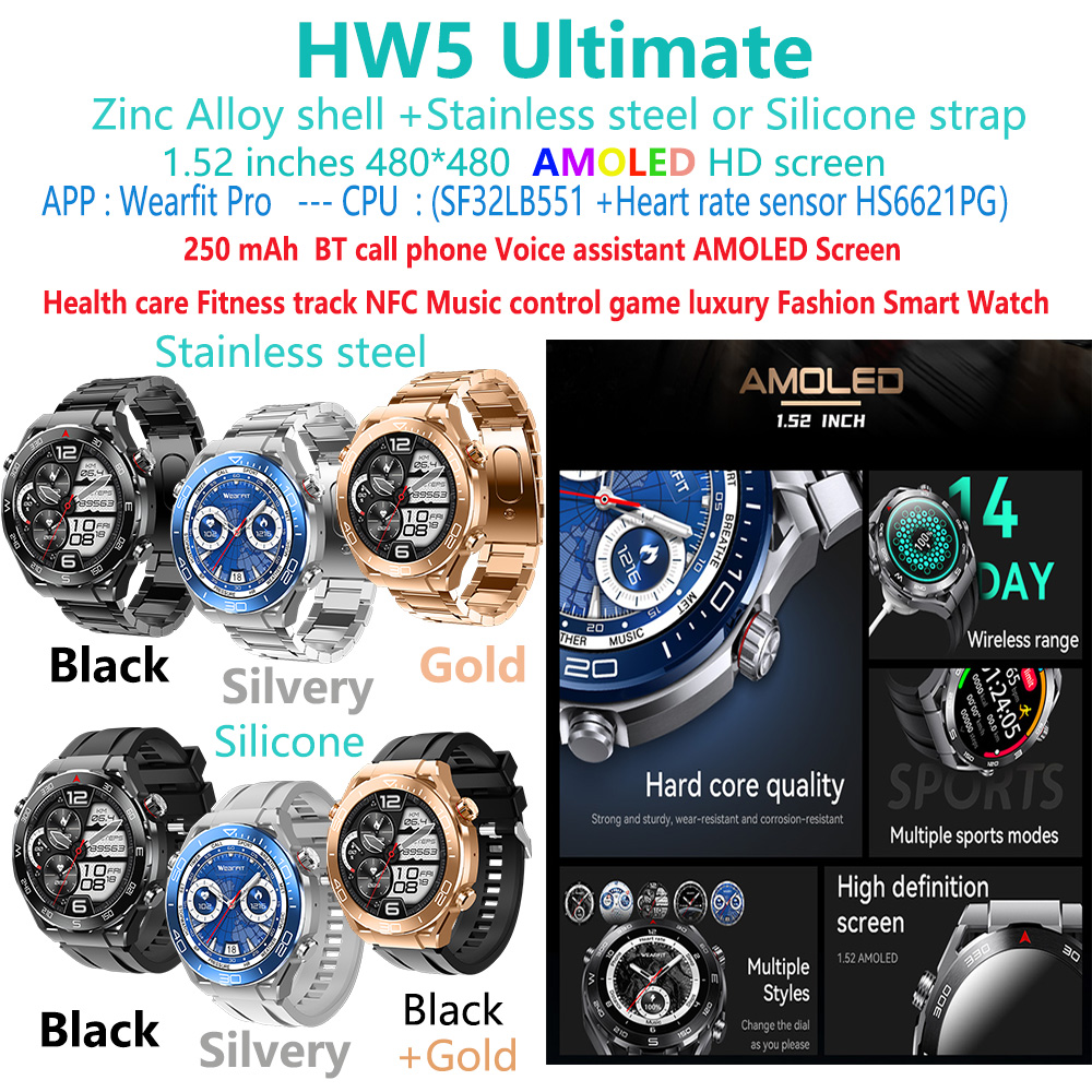 HW5 Ultimate APP Wearfit AMOLED screen Zinc Alloy luxury BT call phone health sport smart watch |
