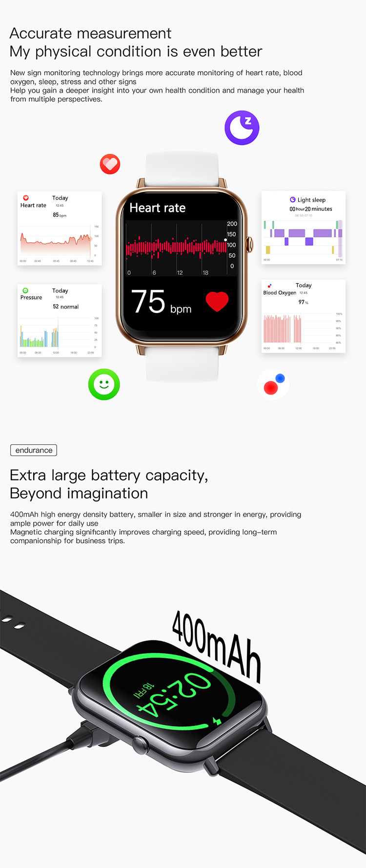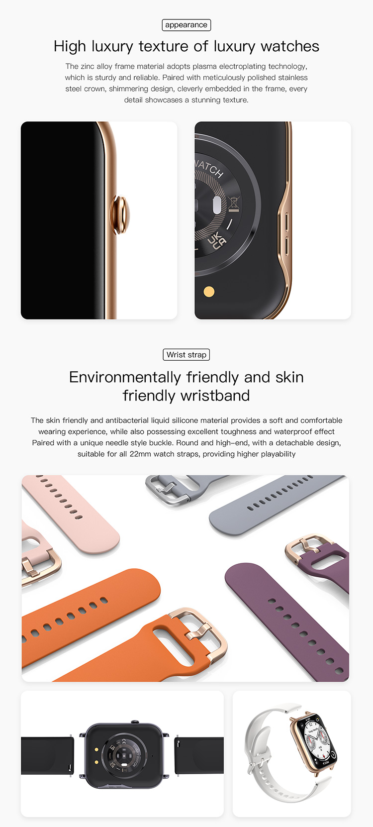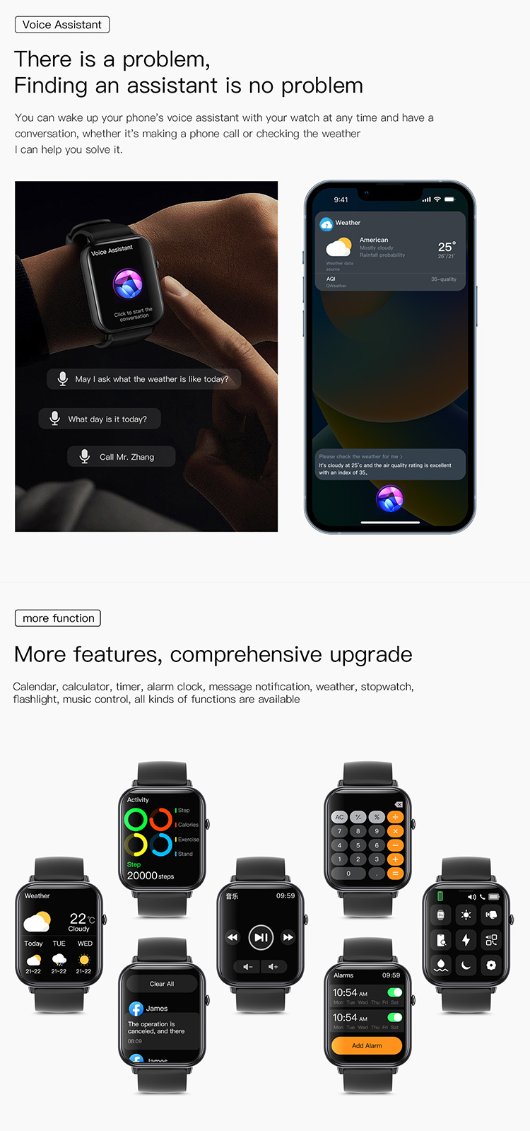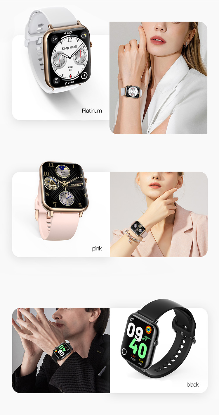 Other functions | BT call, Calendar, Voice Assistant, Find Mobile Phone, Flashlight, Card Settings, Breathing Training, Alarm Clock, Custom Dial, Three Day Weather Forecast, Don't Disturb Mode, Brightness Adjustment, Screen Time Adjustment, Wrist Turn, Camera Control, Music Control, Family Health, Stopwatch, Countdown, Calculator |