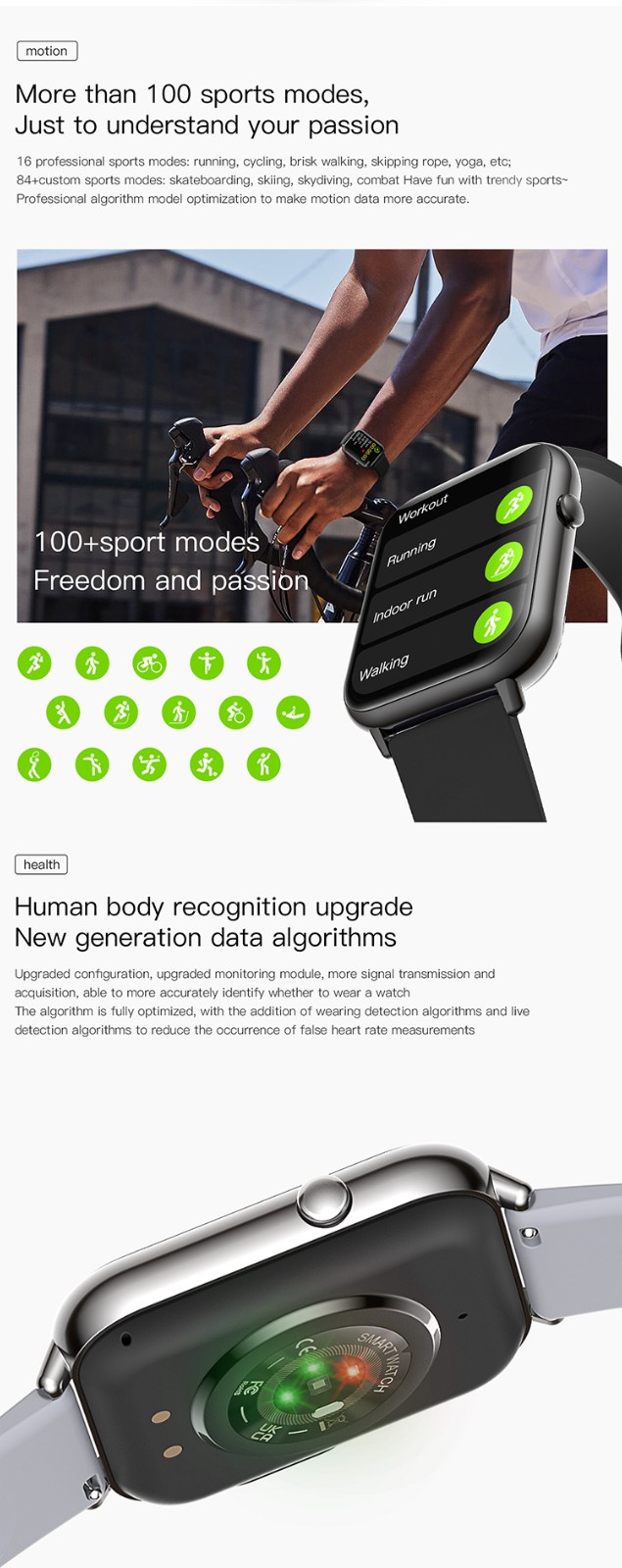 The main function | Motion monitoring | Daily activity records (step count, calories, distance, exercise time, standing time) 104 Motion mode, storing the last 5 motion records Fitness sports: high-intensity training, fitness, free training, elliptical machine, rowing machine, core training, sit-ups, push-ups, fencing, aerobics, group gymnastics, strength training, plate support, boxing, weight lifting, treadmill, taekwondo, taijiquan, martial arts, open-and-shut jump, bobby jump, squat, leg lift, arm training, leg training, walker, cross fit, functional training, physical training, free combat Karate, boxing, kendo, horizontal bar, double pole. Running: running, indoor running. Walking: walking, indoor walking, walking. Cycling: cycling, indoor cycling, dynamic cycling. Yoga: yoga, Pilates. Dance: dance, ballet, belly dance, square dance, street dance, jazz dance, Latin dance. Outdoor sports: mountaineering, orienteering, bungee jumping, skateboarding, roller skating, rock climbing, parkour, hiking, racing, BMX, skydiving. Ball games: badminton, cricket, baseball, golf, rugby, basketball, softball, goalball, volleyball, table tennis, hockey, tennis, football, billiards, bowling, shuttlecock, handball, beach football, squash, cane ball, dodgeball. Ice and snow sports: curling, ice hockey, biathlon, skating, skiing, snowmobile, sledge. Leisure sports: tug-of-war, kite flying, darts, frisbee, horse riding, rope skipping, hula hoop, archery, war games, swing, climbing, obstacle race, fishing. |