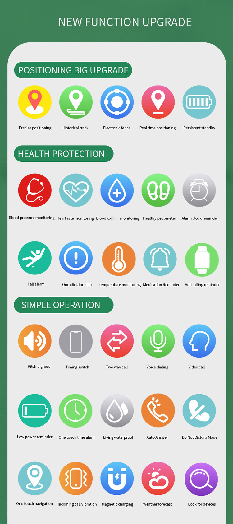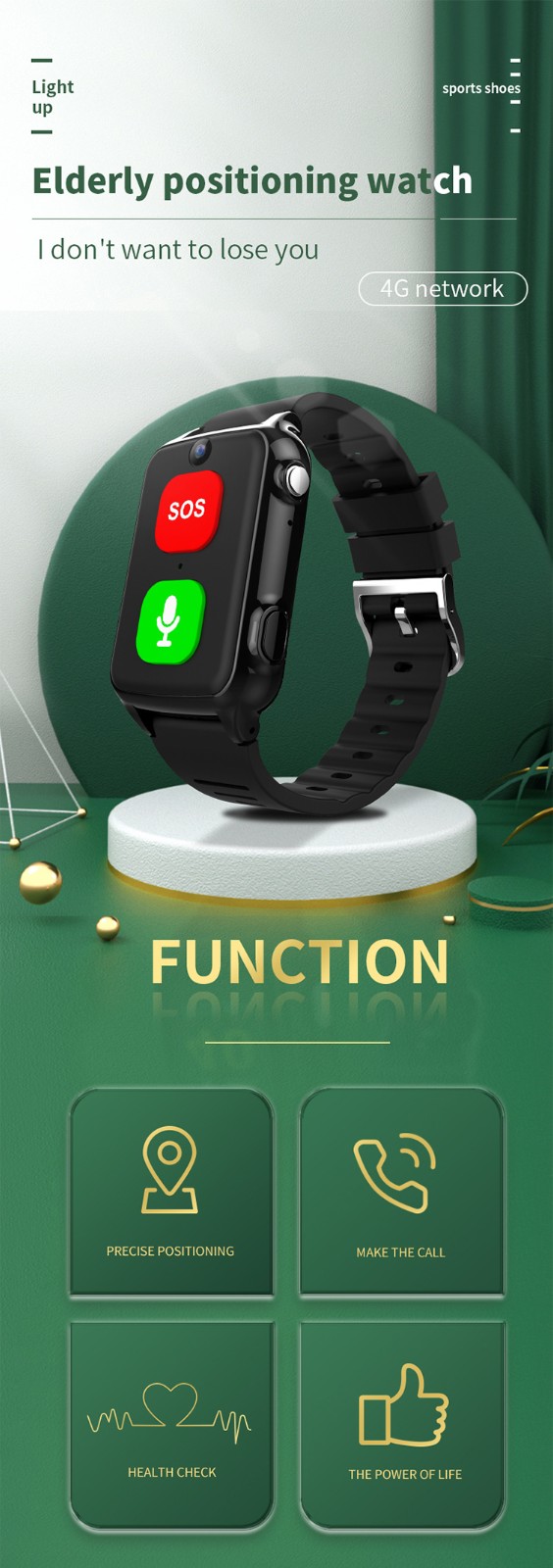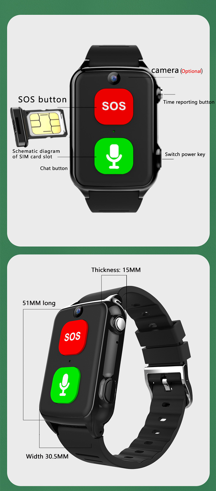 1. Main function : 4G sim card solt+ SOS+ WIFI / GPS / LBS Location + HD camera video call voice chat
