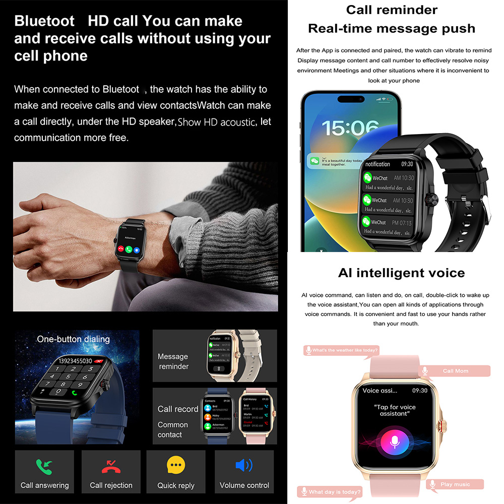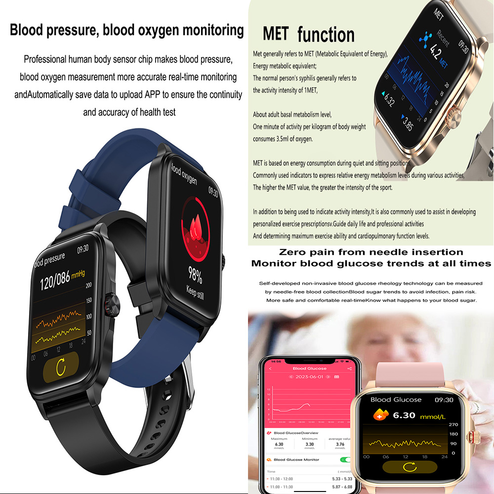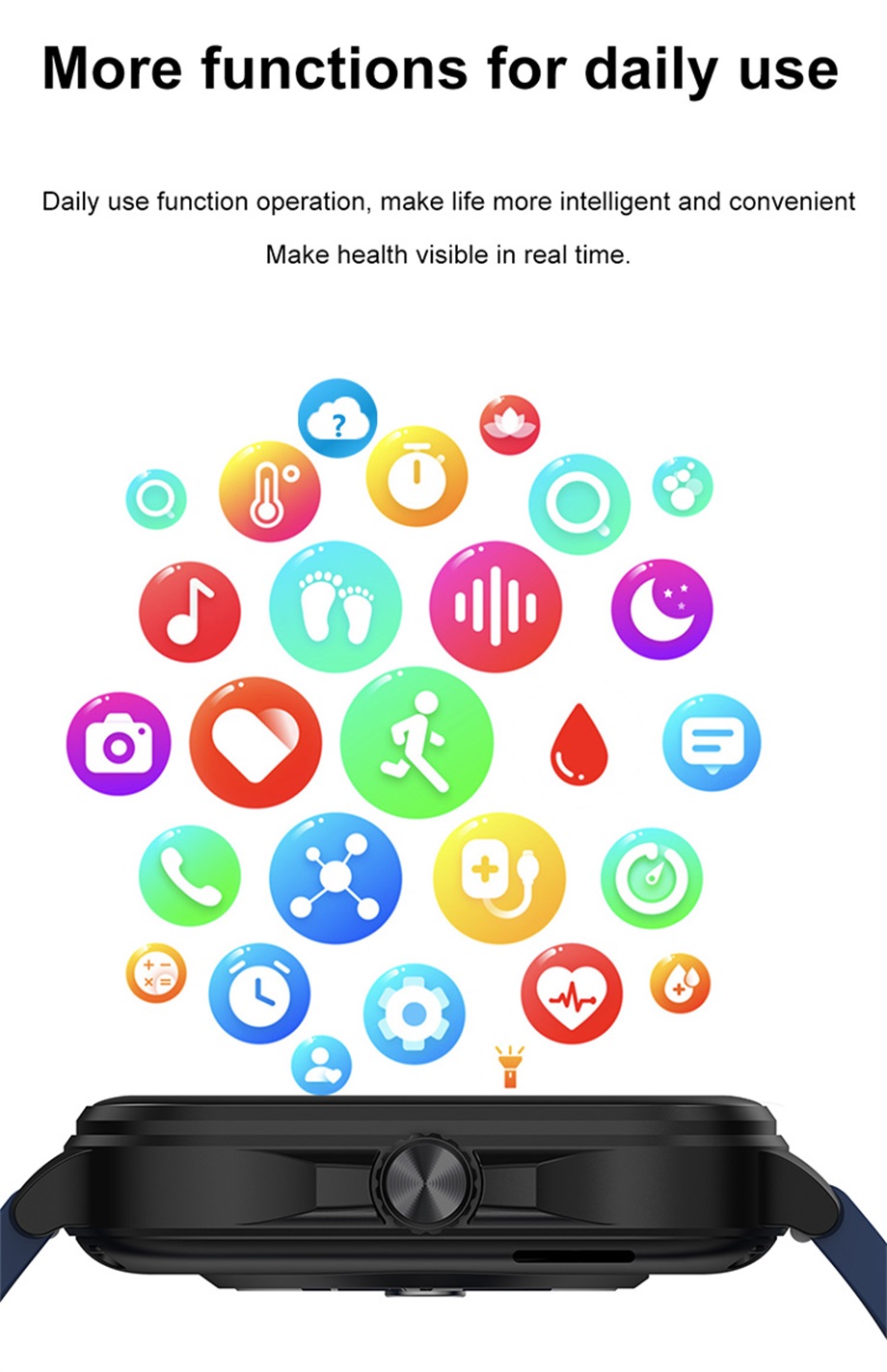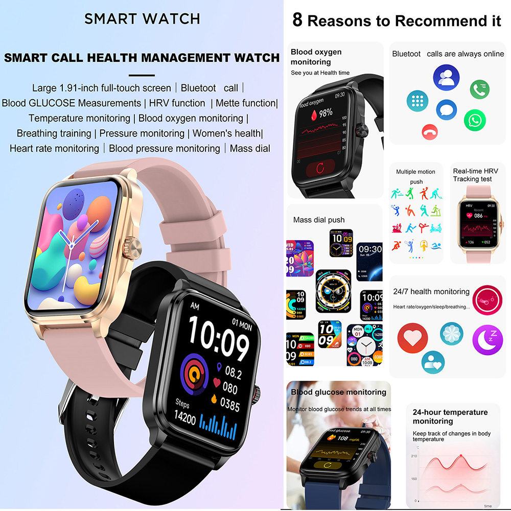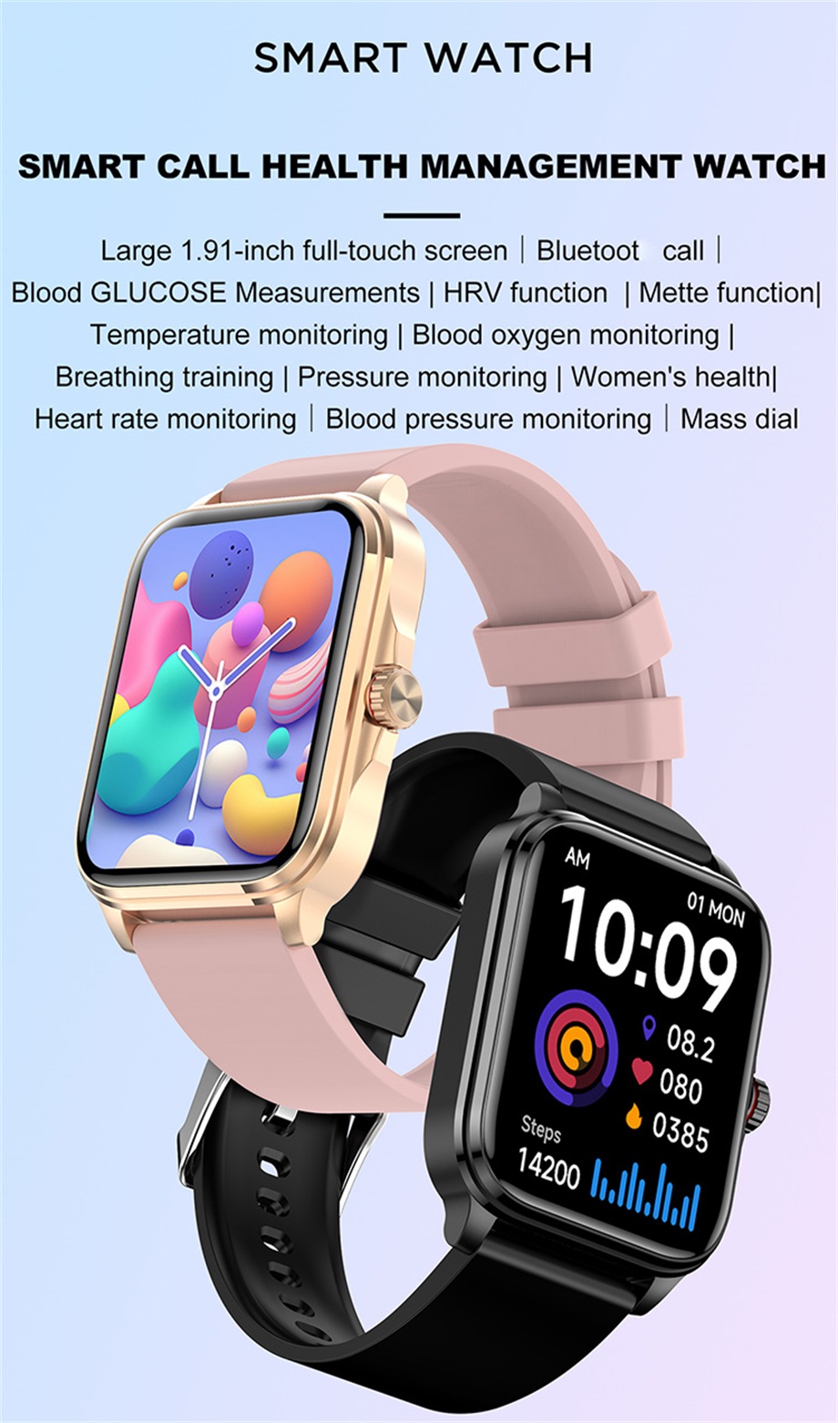 Function Description | 1.BT communication, Long endurance standby. Multiple dial switching, call reminder. 2.non-invasive blood suga measurement, HRV function,Mett function, temperature , blood oxygen , respiratory training, pressure monitoring, female health (menstrual tracking), heart rate , blood pressure , sleep monitoring, sedentary reminder and other health functions. 3.Exercise function: step count/calorie/distance, multiple exercise modes 100+Sport Modes. 4.silent alarm clock, screen, music control, calculator, gaming. 5. 1.91 high-definition 320 * 386 full touch large |