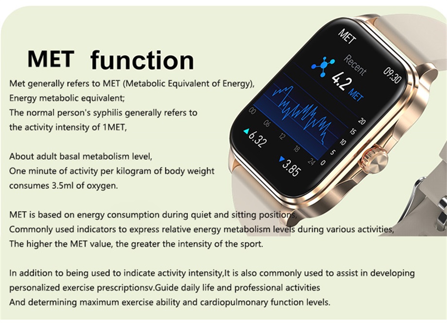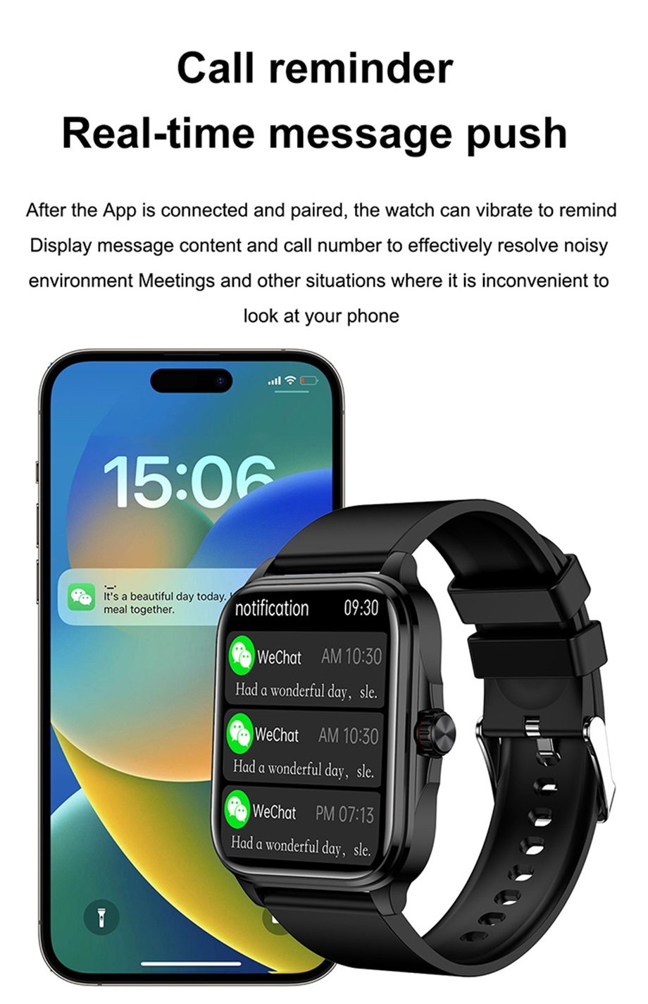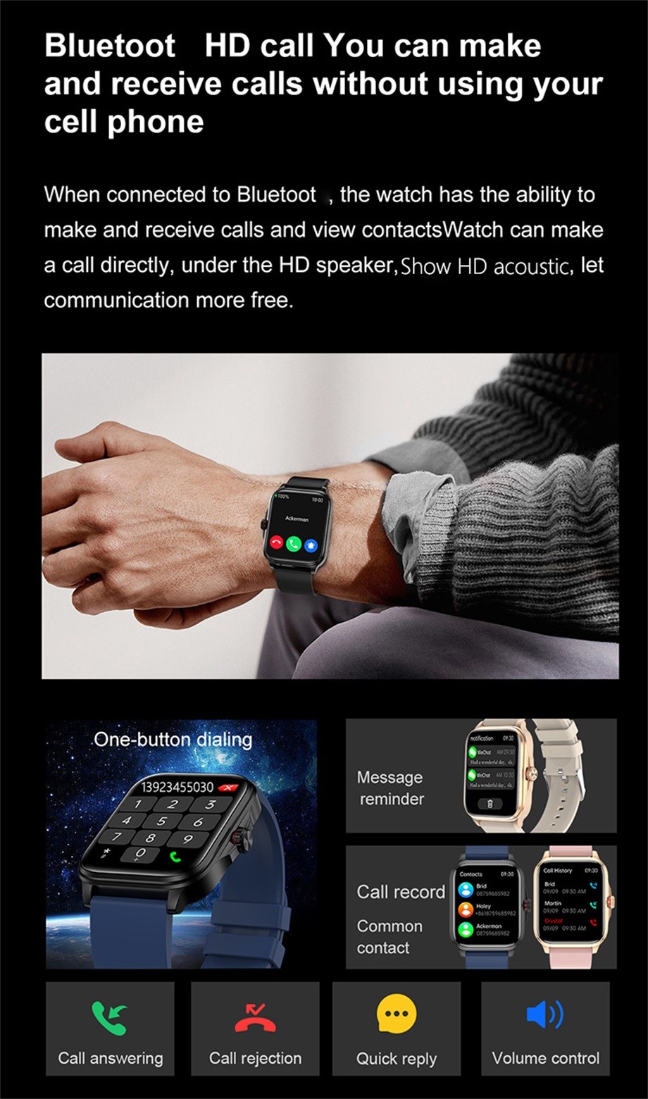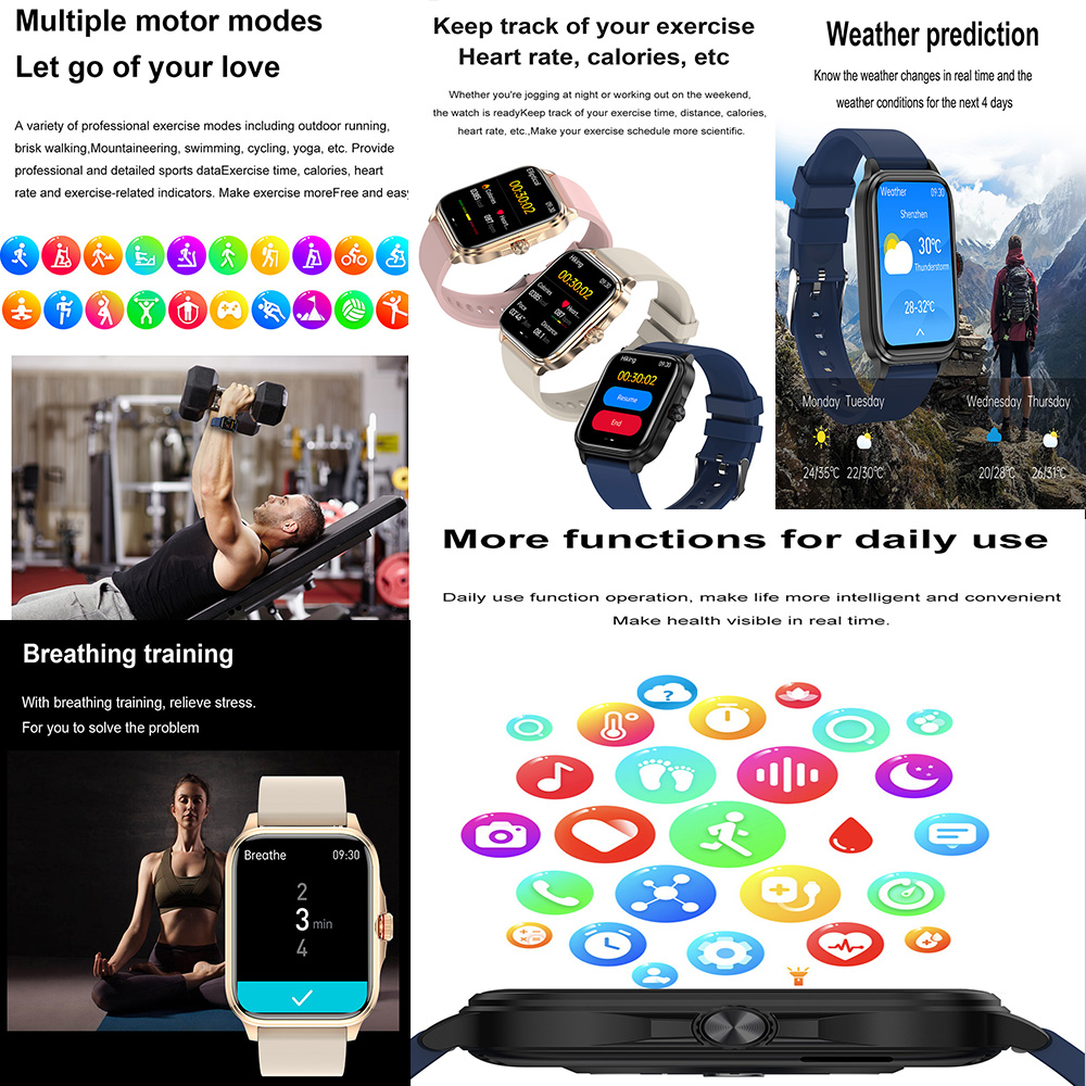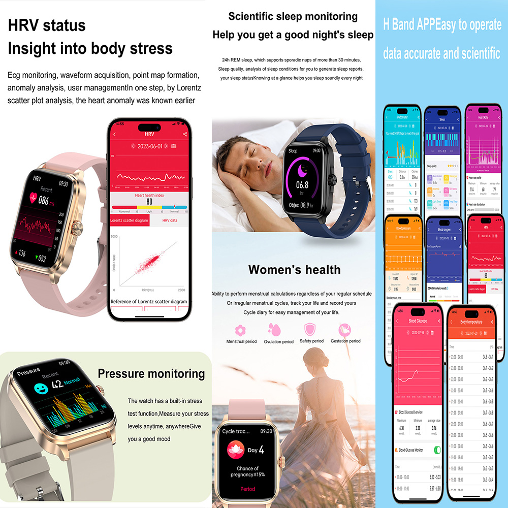 Function Description | 1.BT communication, Long endurance standby. Multiple dial switching, call reminder. 2.non-invasive blood suga measurement, HRV function,Mett function, temperature , blood oxygen , respiratory training, pressure monitoring, female health (menstrual tracking), heart rate , blood pressure , sleep monitoring, sedentary reminder and other health functions. 3.Exercise function: step count/calorie/distance, multiple exercise modes 100+Sport Modes. 4.silent alarm clock, screen, music control, calculator, gaming. 5. 1.91 high-definition 320 * 386 full touch large |