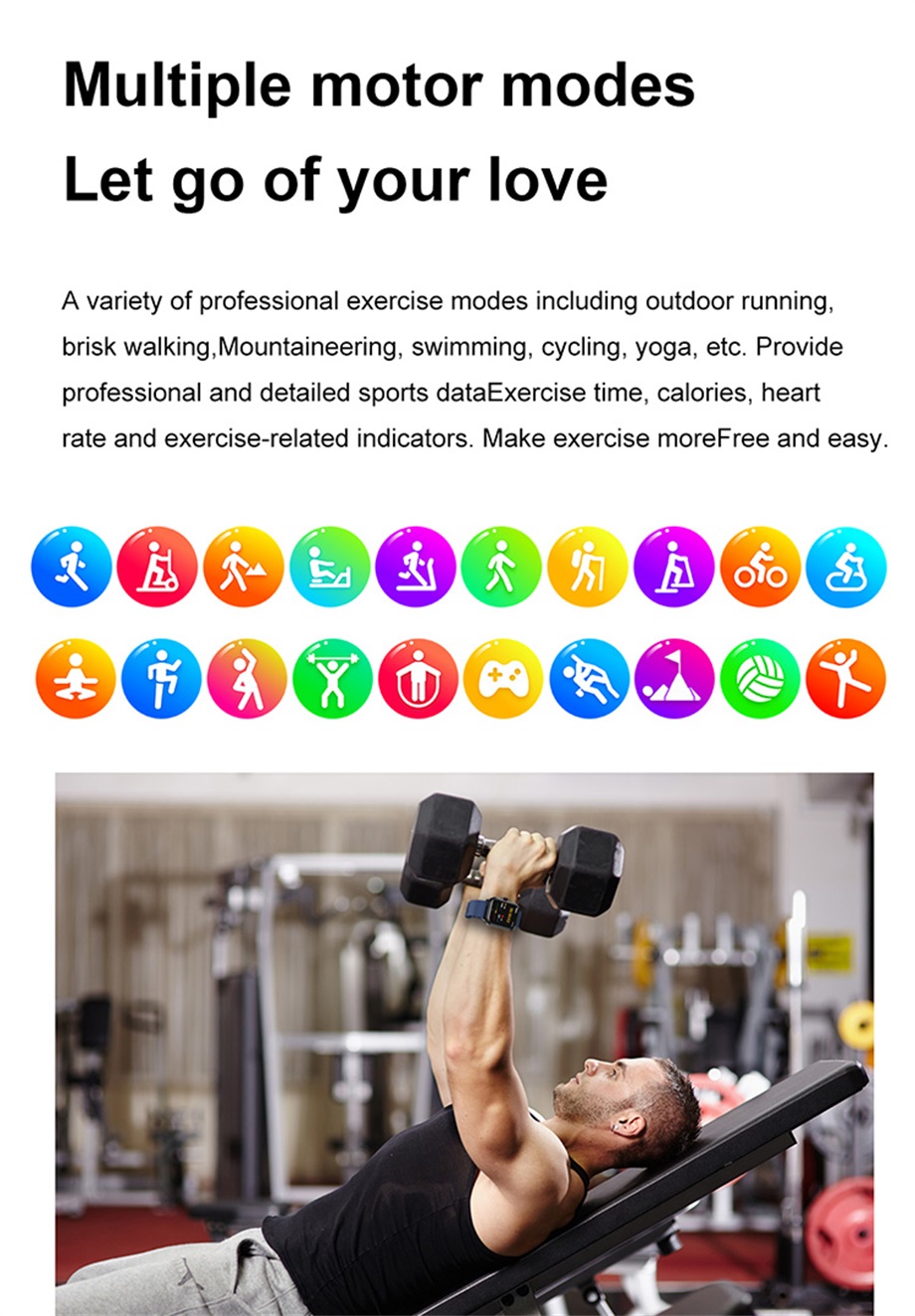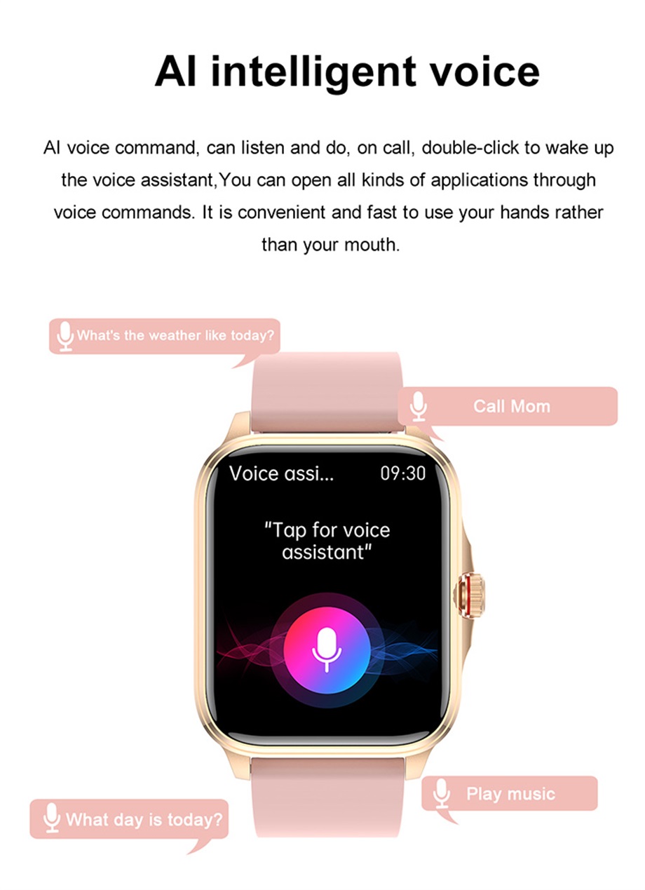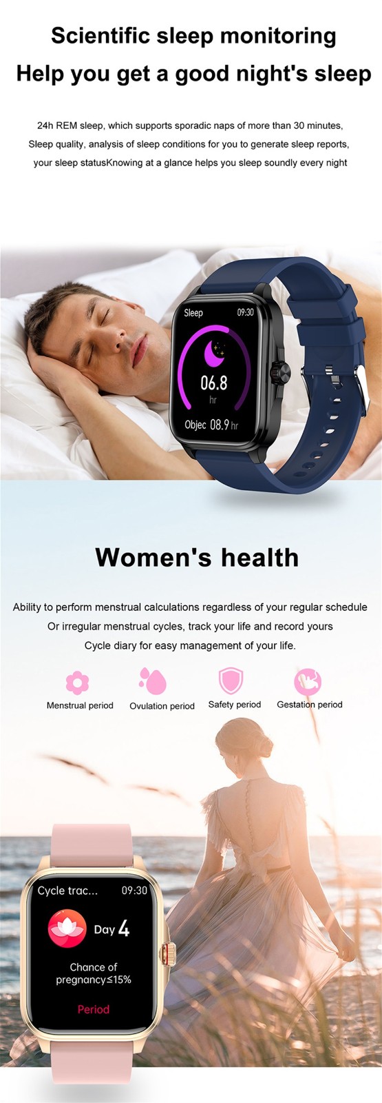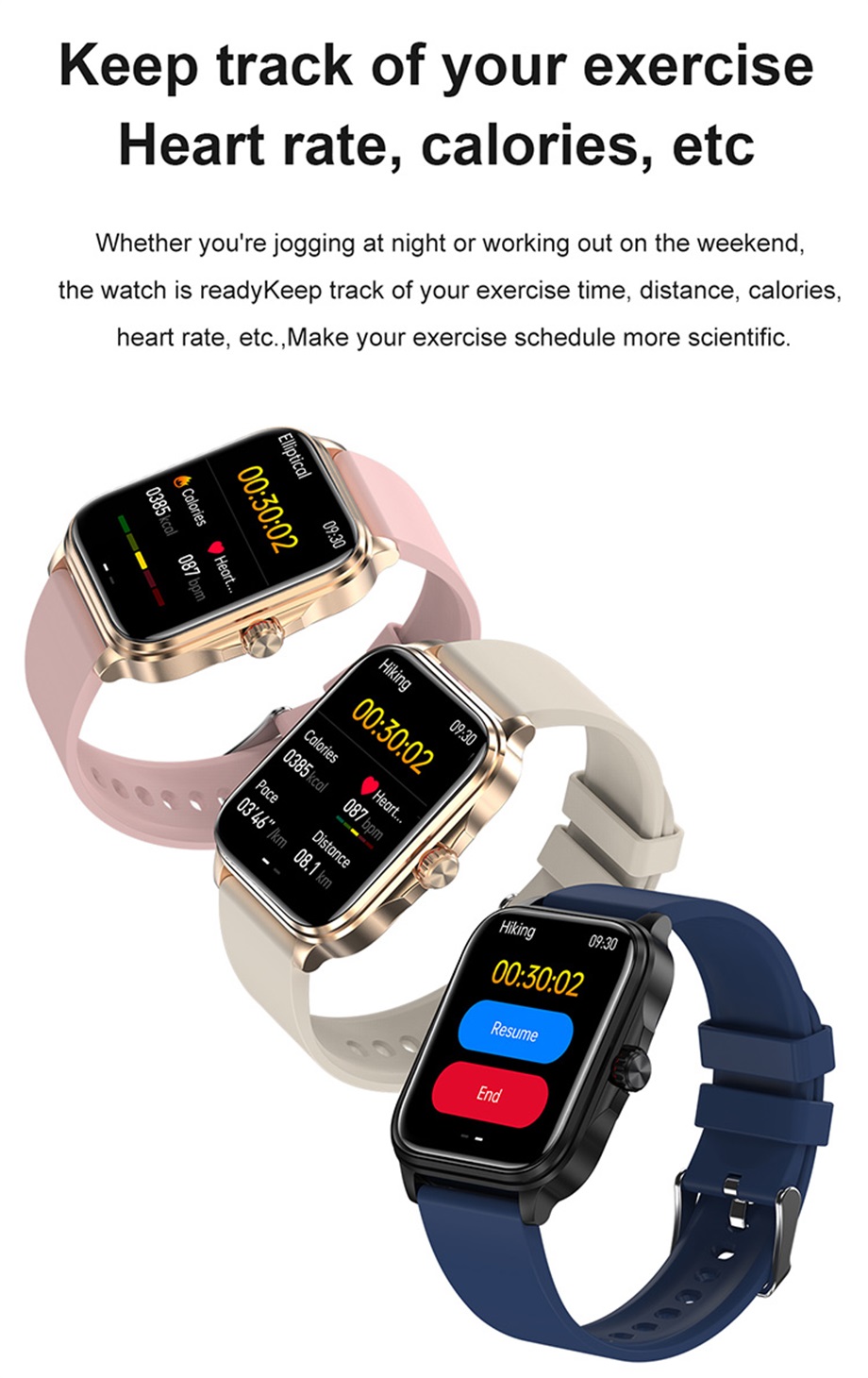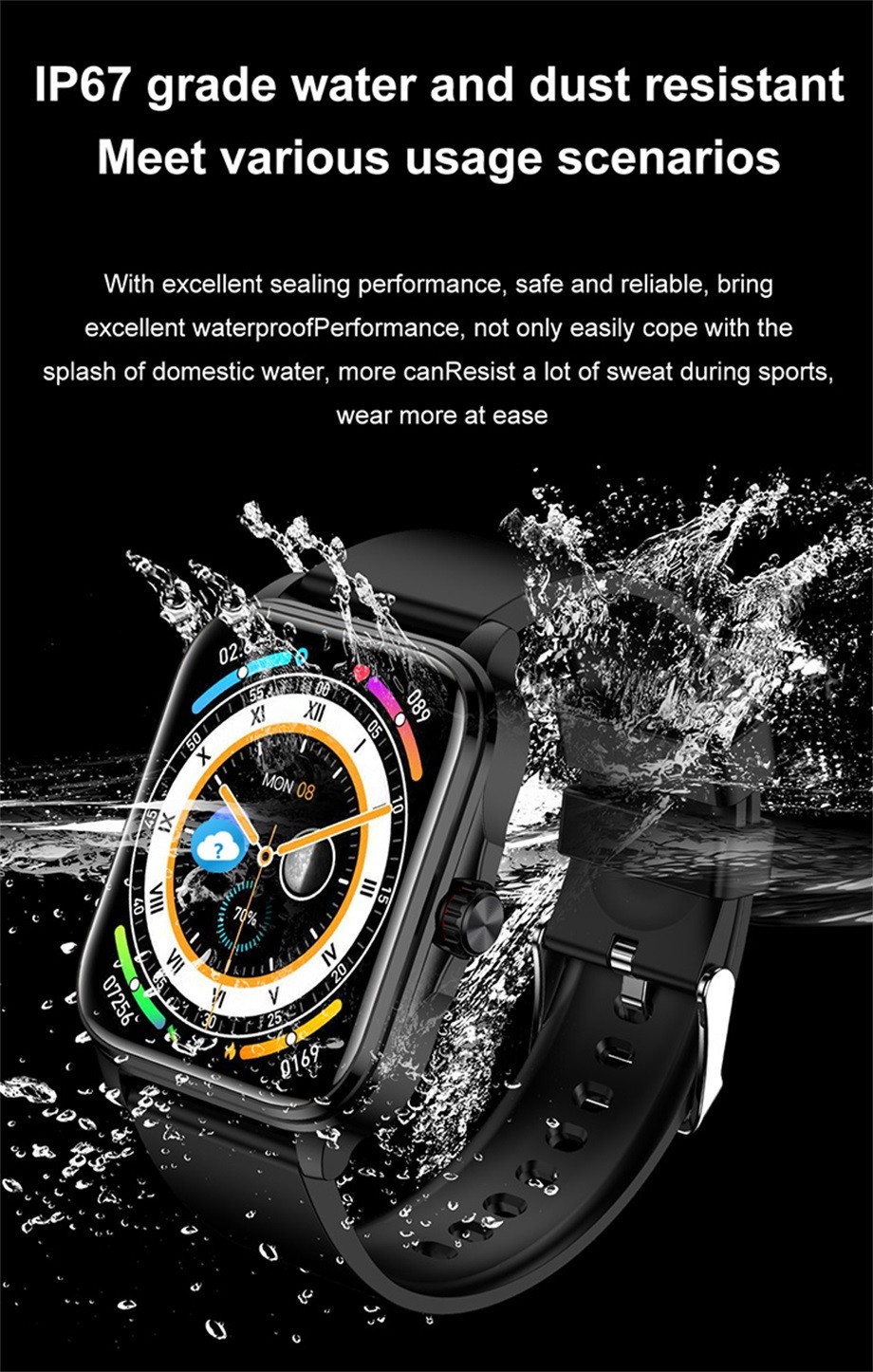 Function Description | 1.BT communication, Long endurance standby. Multiple dial switching, call reminder. 2.non-invasive blood suga measurement, HRV function,Mett function, temperature , blood oxygen , respiratory training, pressure monitoring, female health (menstrual tracking), heart rate , blood pressure , sleep monitoring, sedentary reminder and other health functions. 3.Exercise function: step count/calorie/distance, multiple exercise modes 100+Sport Modes. 4.silent alarm clock, screen, music control, calculator, gaming. 5. 1.91 high-definition 320 * 386 full touch large |