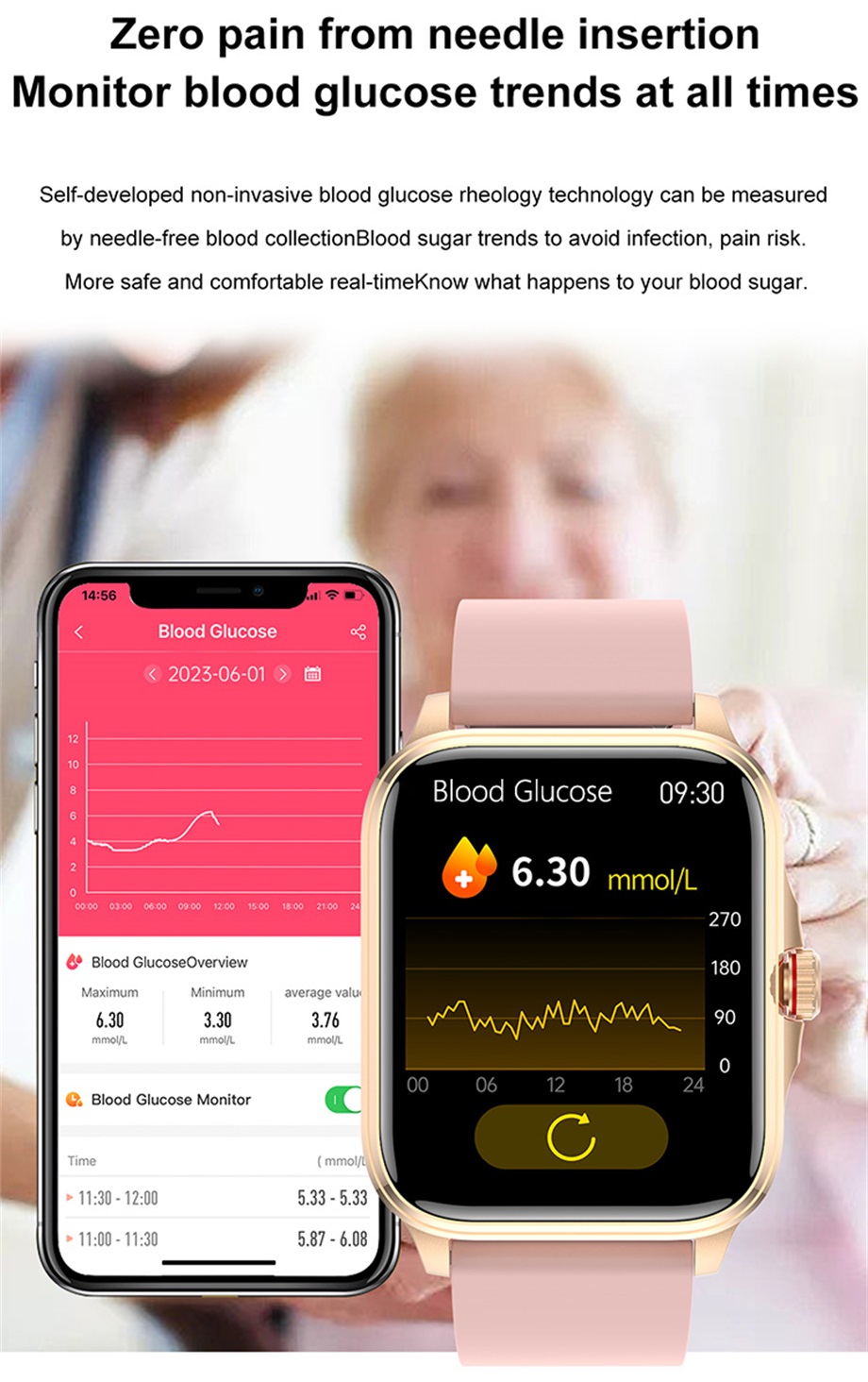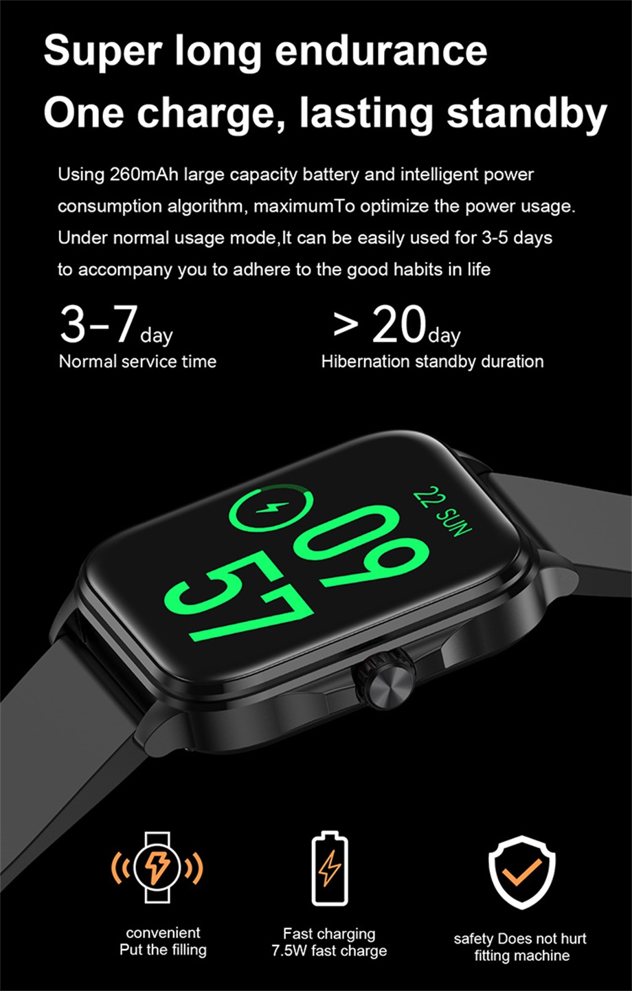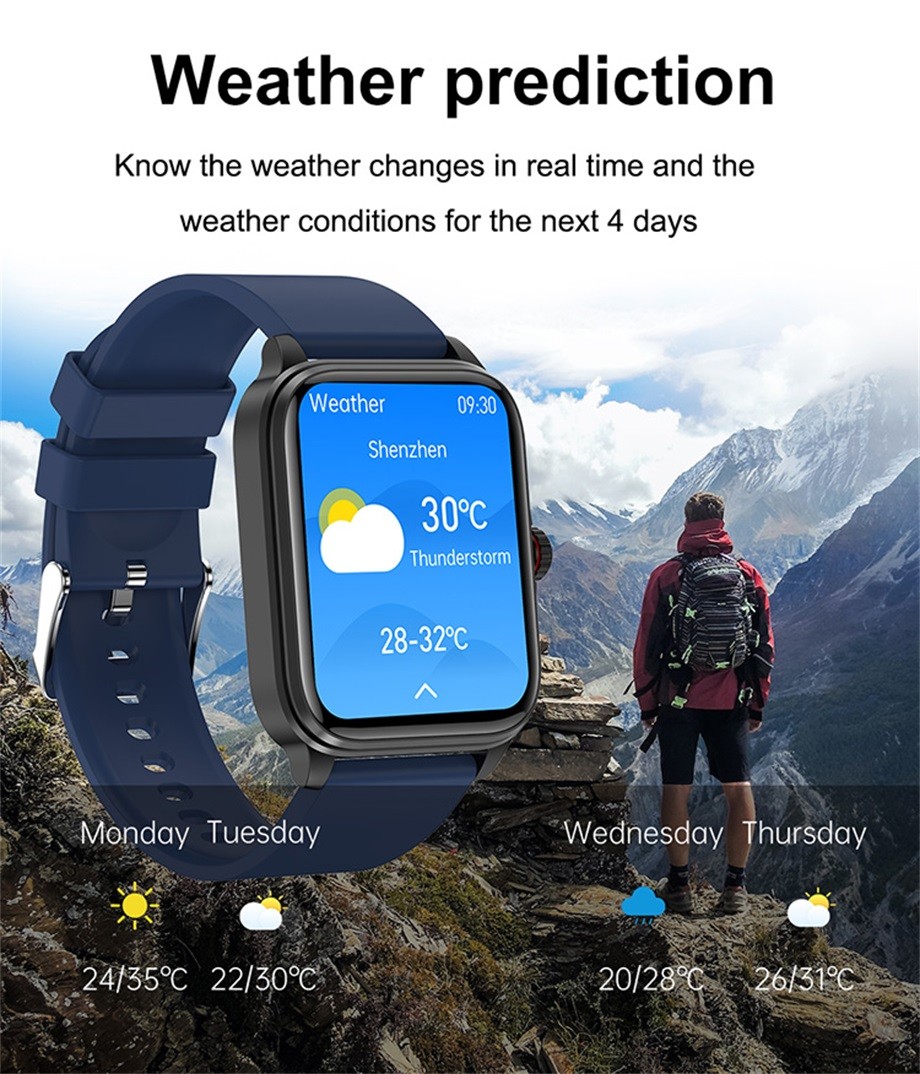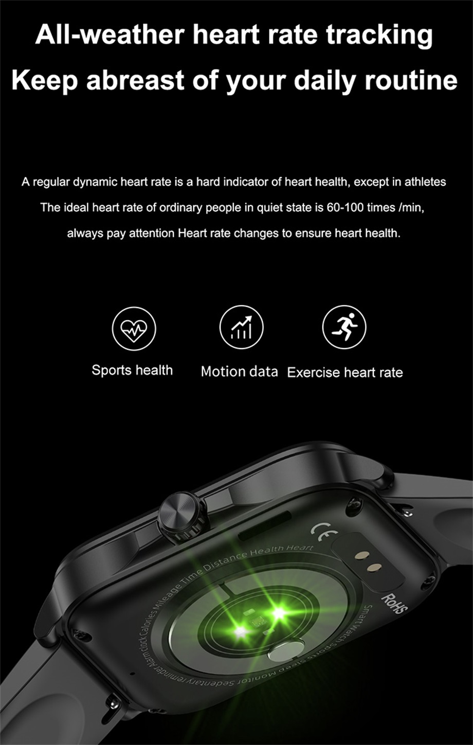 Function Description | 1.BT communication, Long endurance standby. Multiple dial switching, call reminder. 2.non-invasive blood suga measurement, HRV function,Mett function, temperature , blood oxygen , respiratory training, pressure monitoring, female health (menstrual tracking), heart rate , blood pressure , sleep monitoring, sedentary reminder and other health functions. 3.Exercise function: step count/calorie/distance, multiple exercise modes 100+Sport Modes. 4.silent alarm clock, screen, music control, calculator, gaming. 5. 1.91 high-definition 320 * 386 full touch large |
