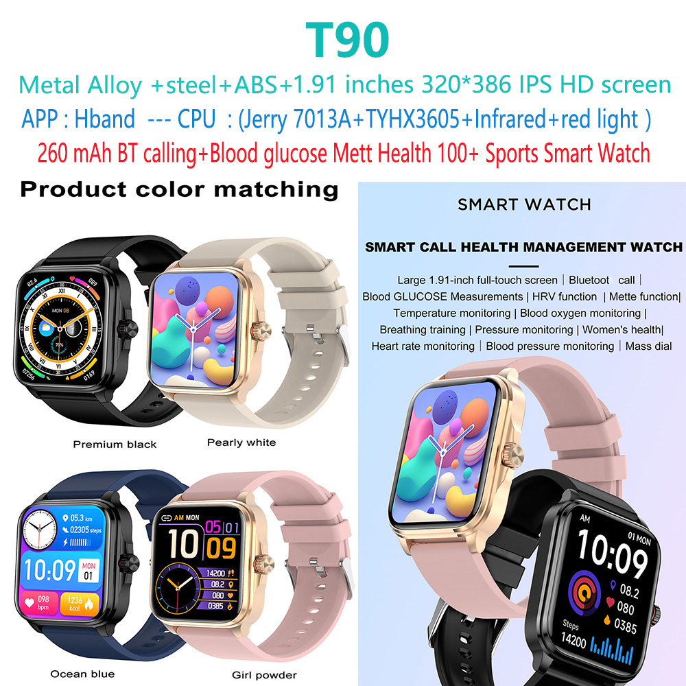 T90 One click connection BT calling phone non-invasive blood suga Mett Health Fitness monitoring 100+ sport modes smart watch |