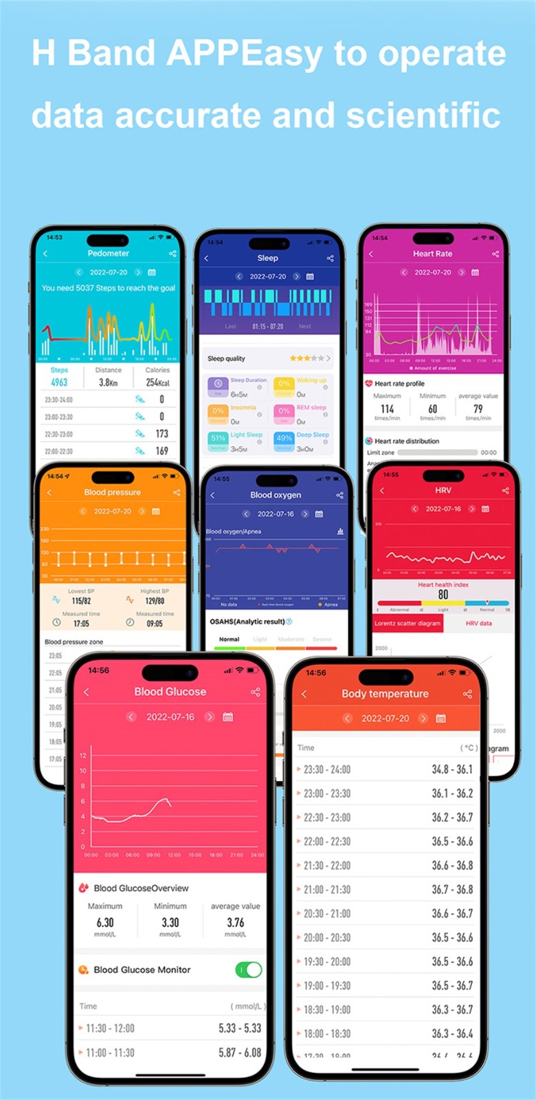 Function points | 1.BT One click communication,BT calling phone 2.Non-invasive blood suga measurement, HRV function, Mett function, temperature , blood oxygen , respiratory training, pressure monitoring, female health (menstrual tracking), heart rate , blood pressure , sleep monitoring, sedentary reminder ,Female menstrual period and other health functions. 3.Step count/calorie count/distance, 100+Sport Modes multiple motion modes, music control, full screen touch. 4.APP: Hband |