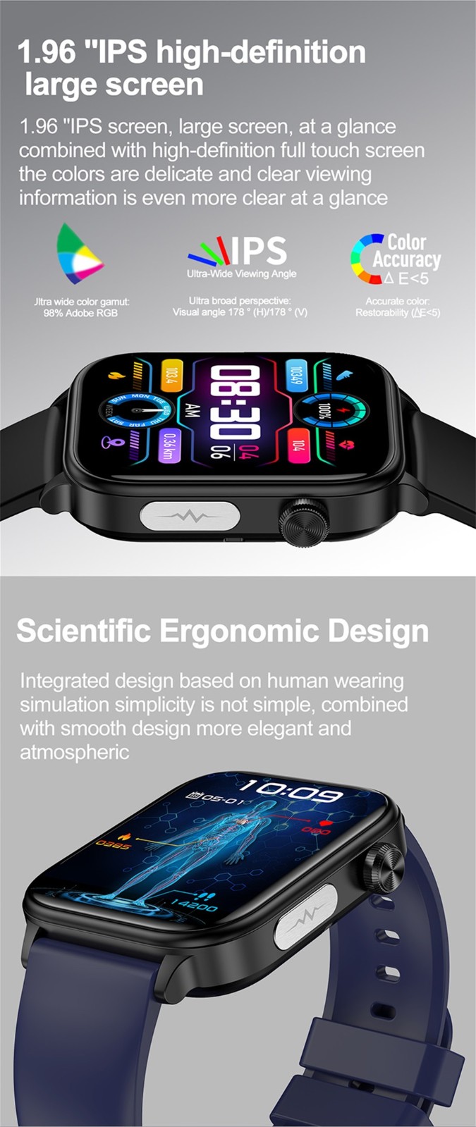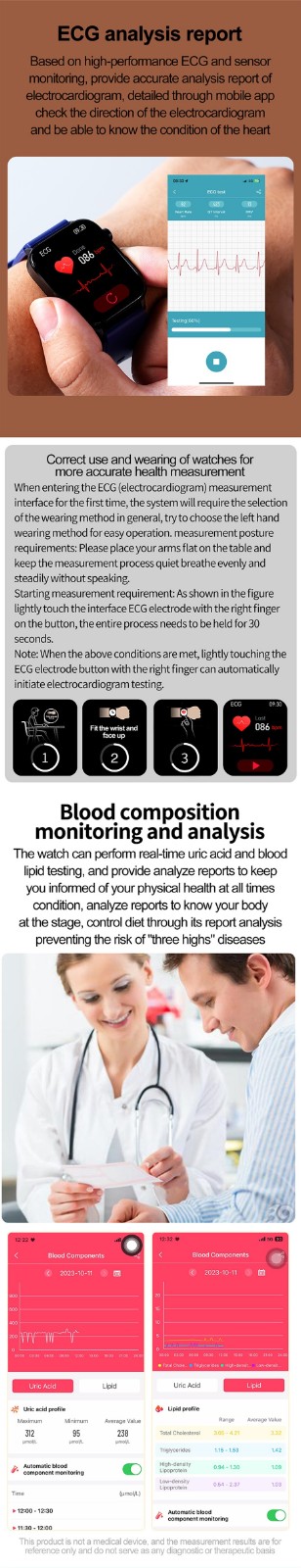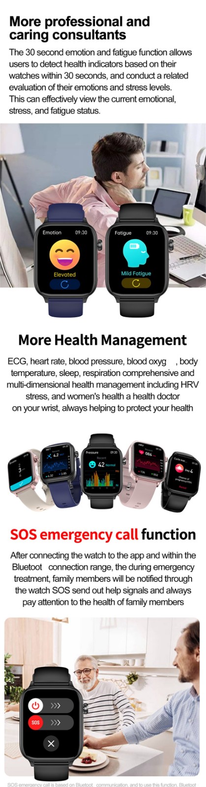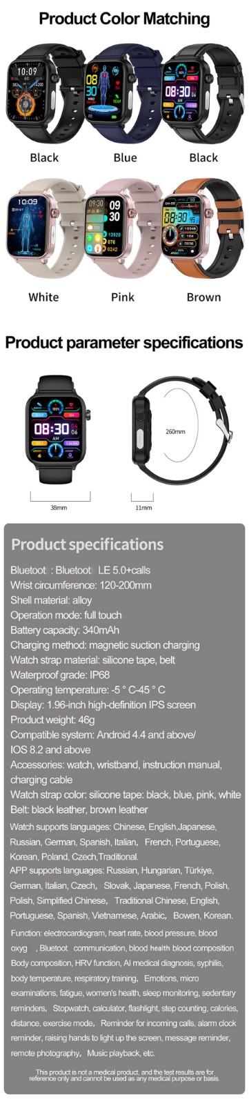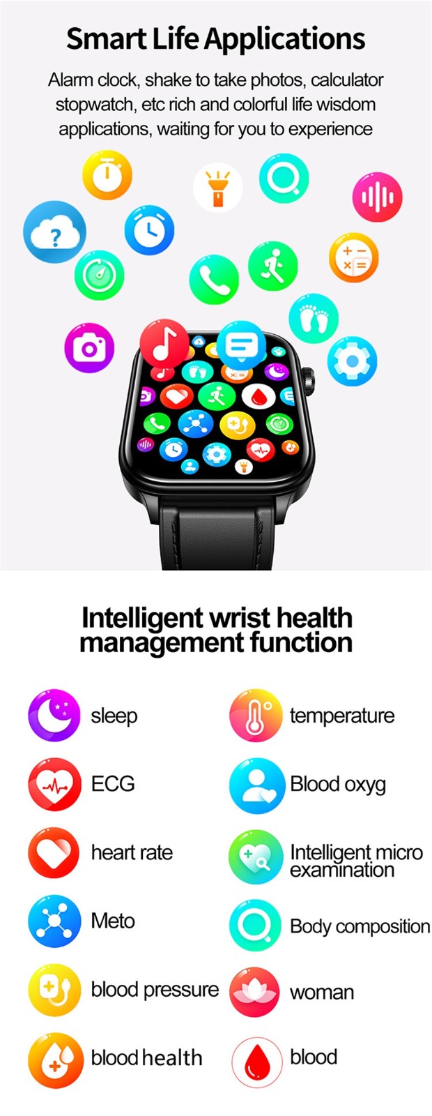 Function points | 1.BT communication,intelligent voice assistant 2.ECG Electrocardiogram function, noninvasive blood health measurement, blood component (uric acid and blood lipid) monitoring, body component (BMI body fat function) testing, intelligent micro-examination, HRV function, AI medical diagnosis, Metope function, body temperature , blood Ox, respiratory training, emotion detection, fatigue detection, stress monitoring, women's health (menstrual tracking), heart rate , blood pressure , sleep monitoring 3.Step counting/calories/distance, multi-movement mode, 4.Music control,game 5. 1.39-inch IPS 360*360 full HD touch screen . 6.APP: Hband |