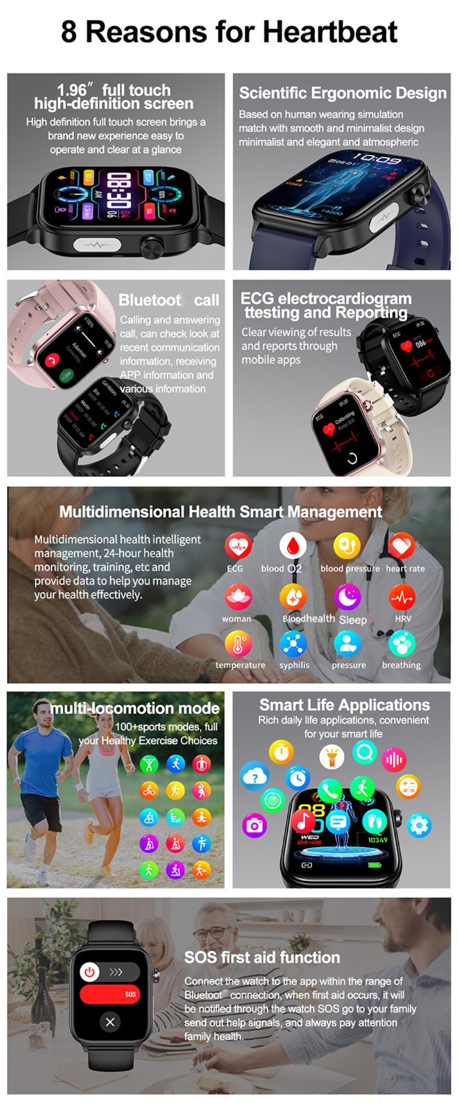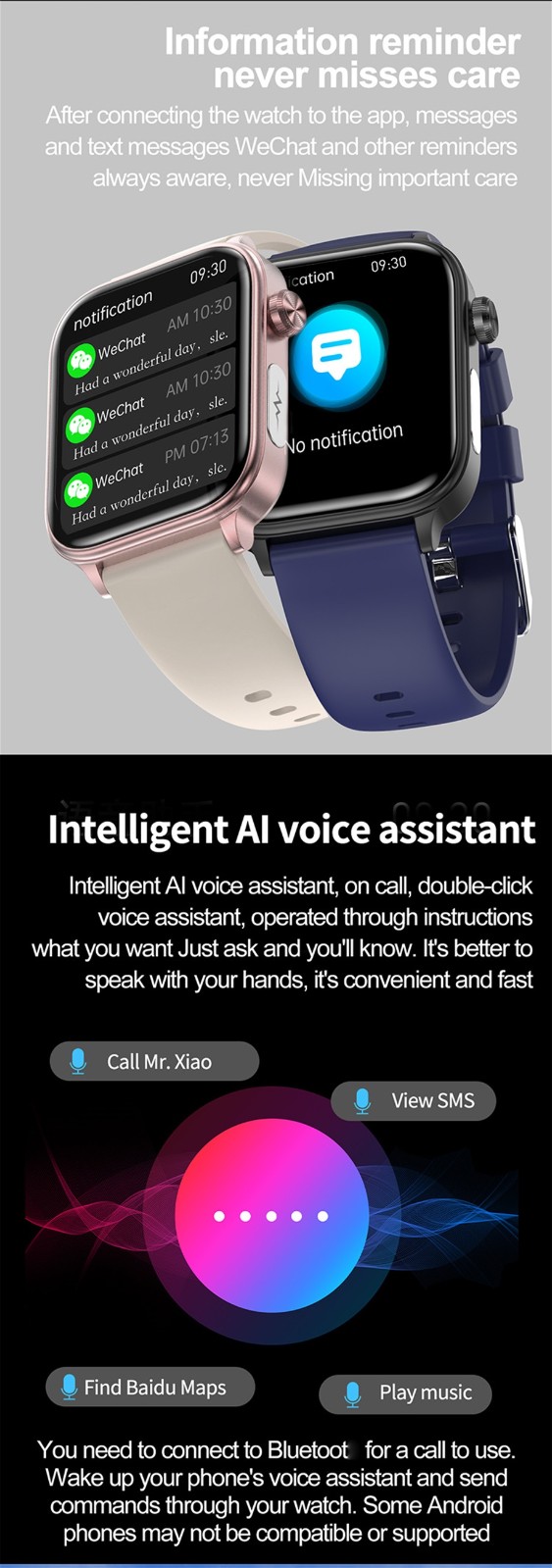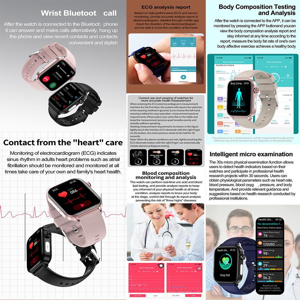 Function points | 1.BT communication,intelligent voice assistant 2.ECG Electrocardiogram function, noninvasive blood health measurement, blood component (uric acid and blood lipid) monitoring, body component (BMI body fat function) testing, intelligent micro-examination, HRV function, AI medical diagnosis, Metope function, body temperature , blood Ox, respiratory training, emotion detection, fatigue detection, stress monitoring, women's health (menstrual tracking), heart rate , blood pressure , sleep monitoring 3.Step counting/calories/distance, multi-movement mode, 4.Music control,game 5. 1.39-inch IPS 360*360 full HD touch screen . 6.APP: Hband |
