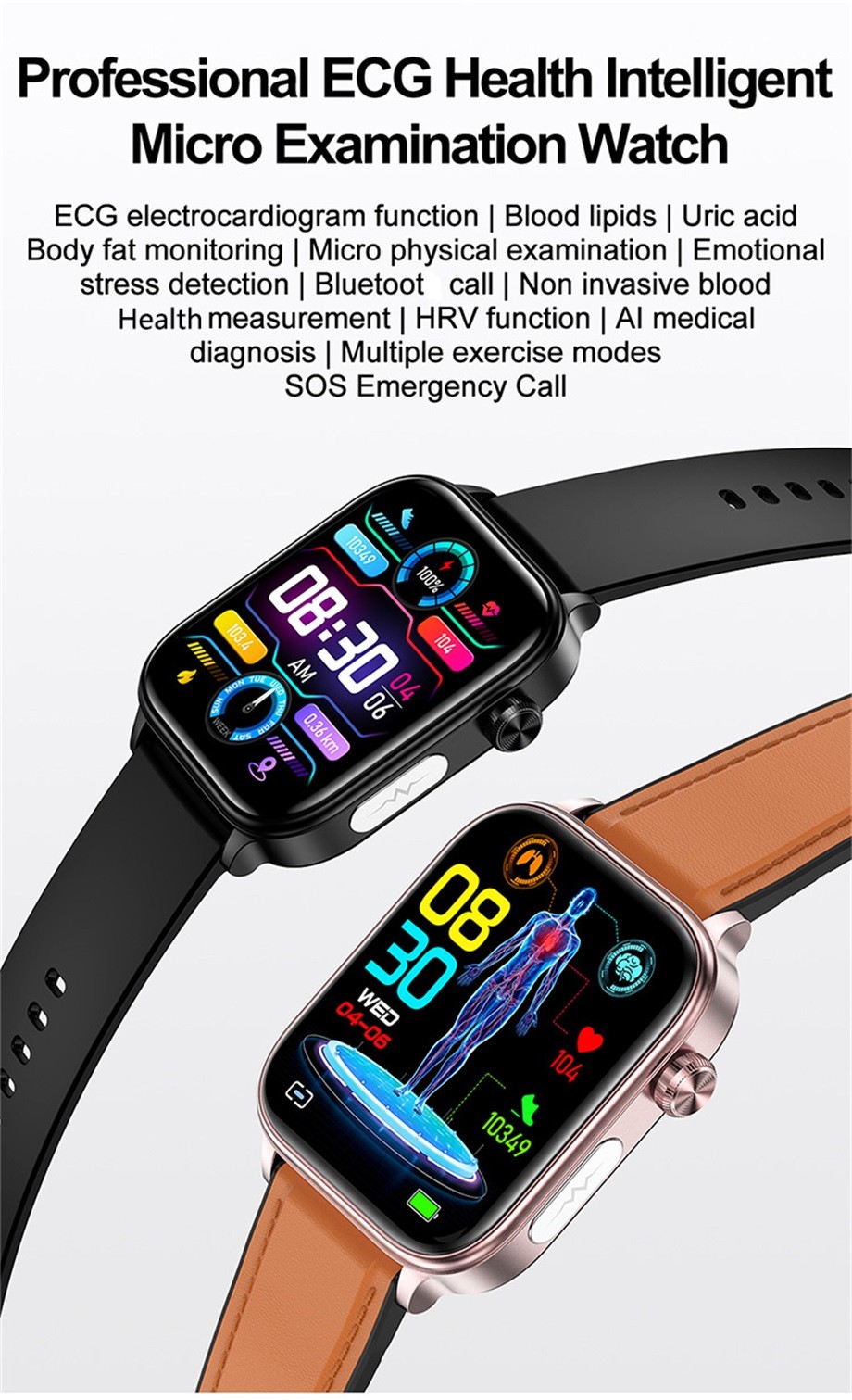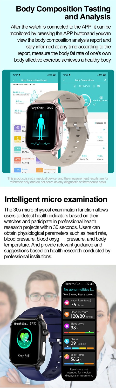 Health Features | ECG Electrocardiogram function, noninvasive blood health measurement, blood component (uric acid and blood lipid) monitoring, body component (BMI body fat function) testing, intelligent micro-examination, HRV function, AI medical diagnosis, Metope function, body temperature , blood Ox, respiratory training, emotion detection, fatigue detection, stress monitoring, women's health (menstrual tracking), heart rate , blood pressure , sleep monitoring Step counting/calories/distance, multi-movement mode |