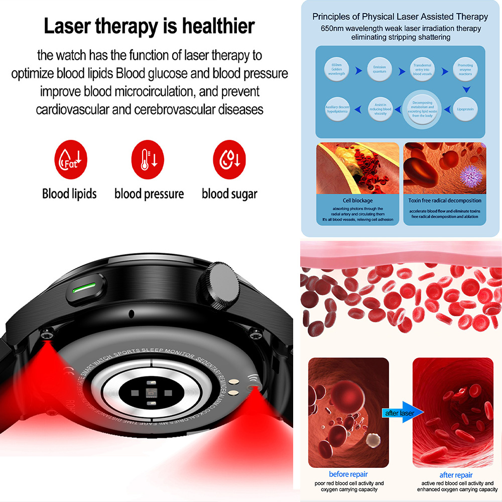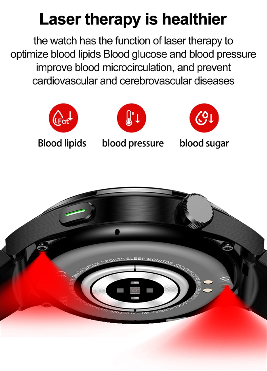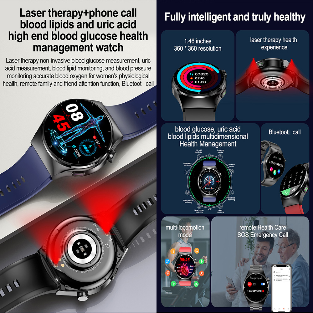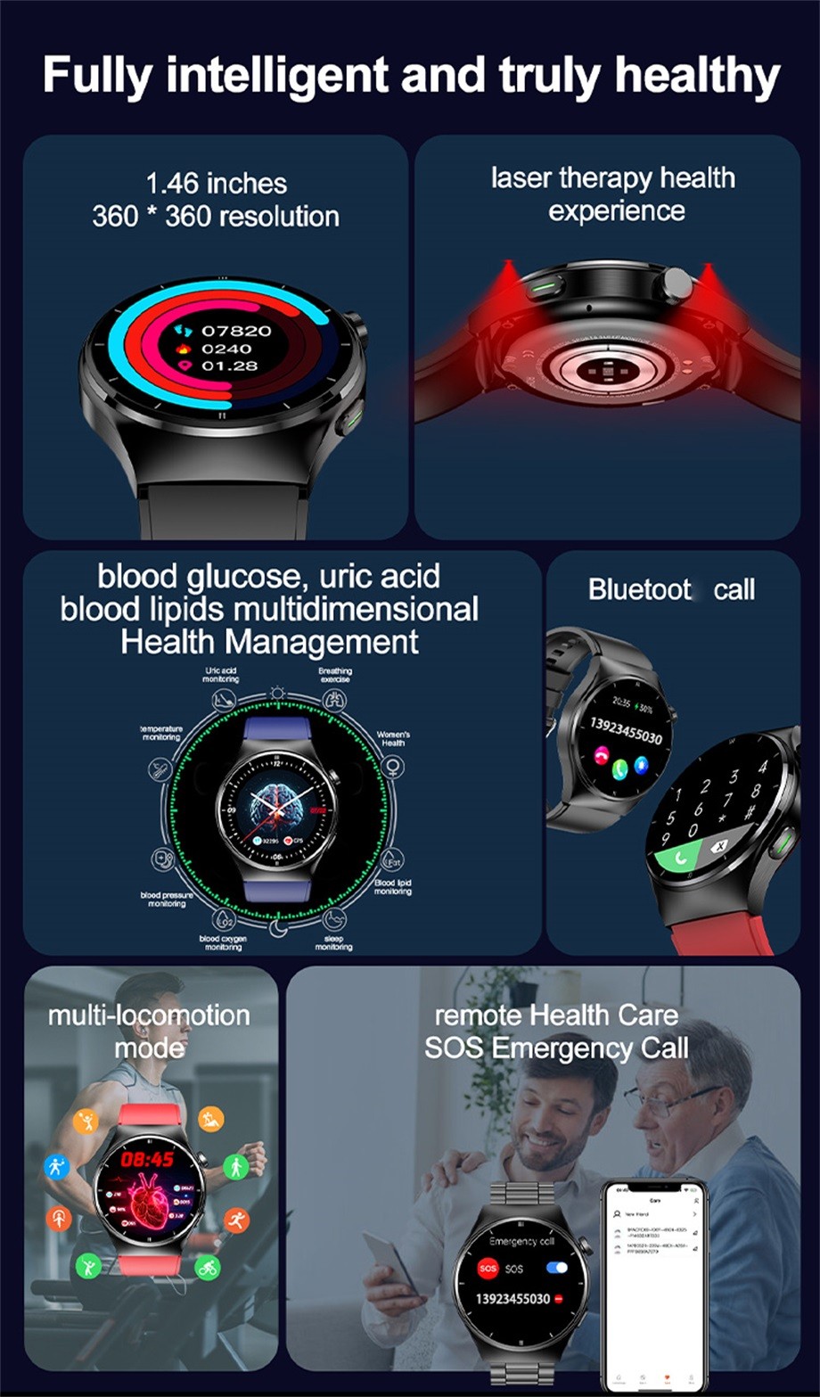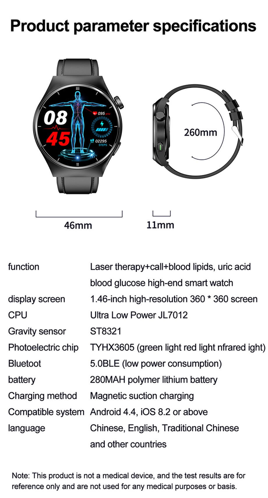 Special Features | 1.Laser physiotherapy+ call +lipid uric acid blood sugar high-end health management watch; 2.Laser therapy, non-invasive blood glucose measurement, uric acid measurement, blood lipid monitoring, blood pressure monitoring; 3. Female physiological health remote relatives and friends care function BT call; 4.The watch has the function of laser physiotherapy, optimize blood lipid blood glucose blood pressure, improve blood microcirculation, prevent cardiovascular and cerebrovascular diseases 5.blood glucose, blood lipid, uric acid, body temperature, blood pressure, blood oxygen, sleep and other monitoring, breathing training, all kinds of health functions are always concerned, for your all-weather health escort |