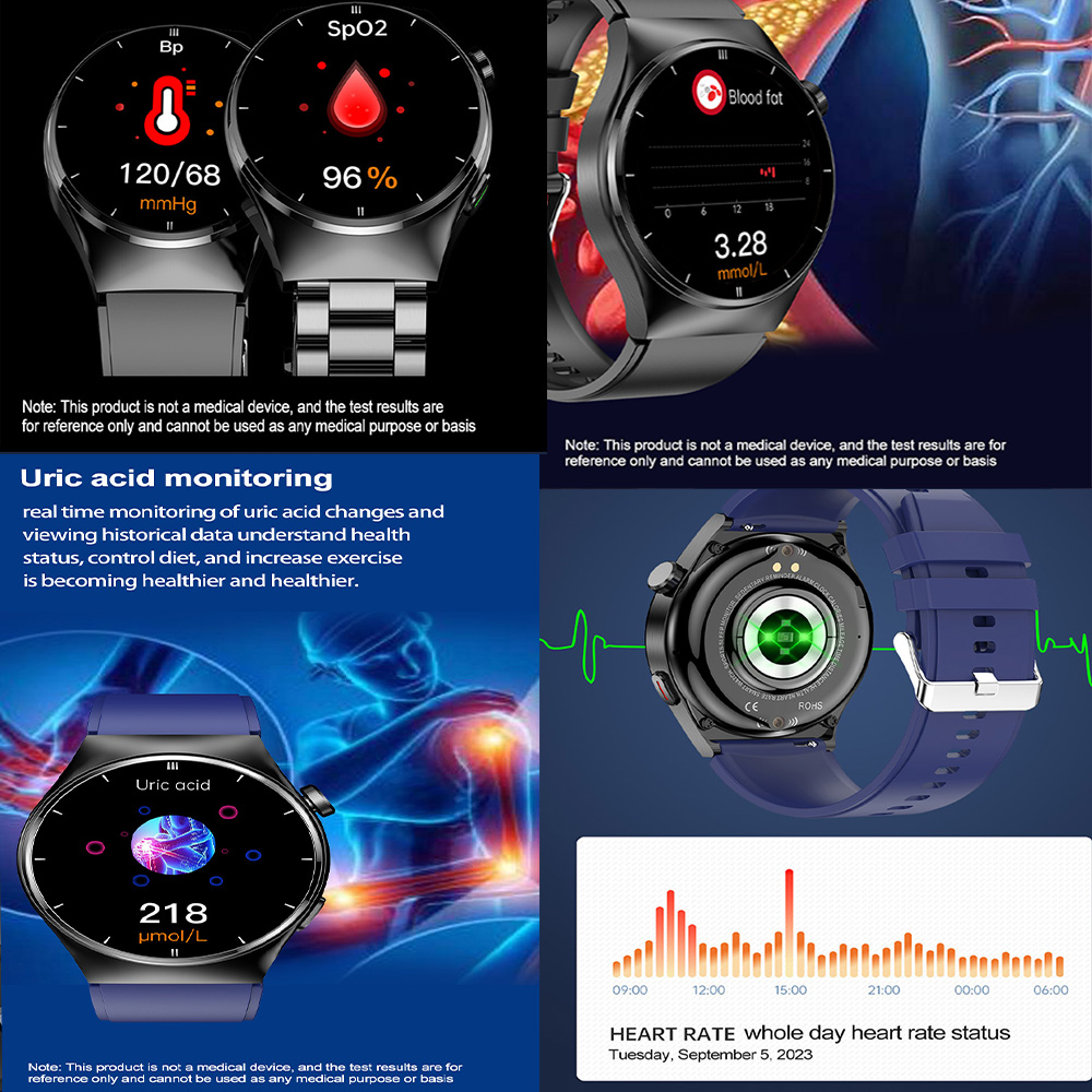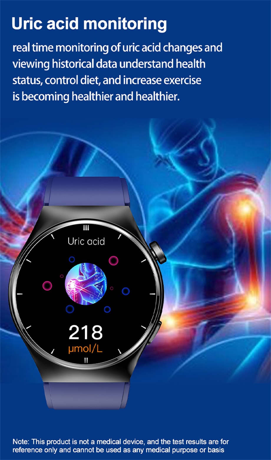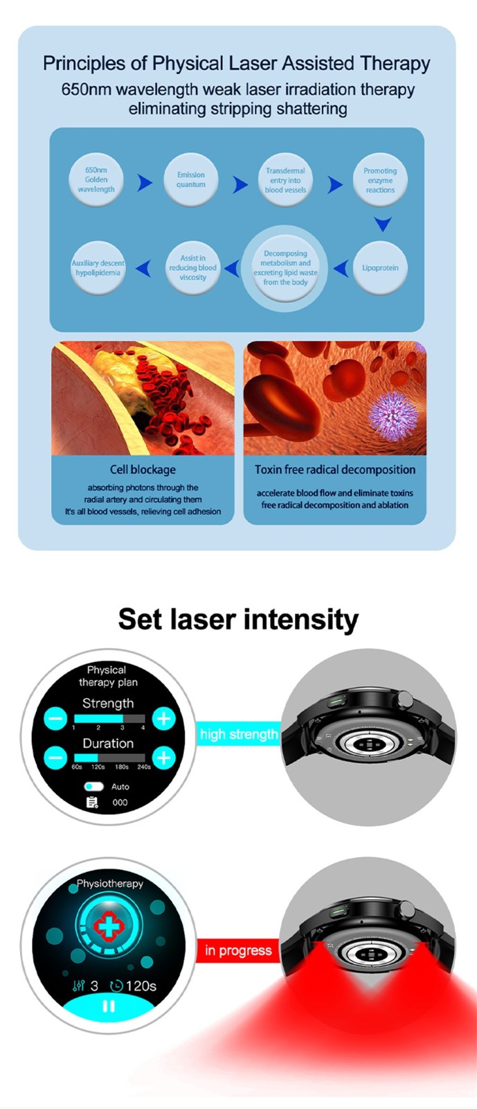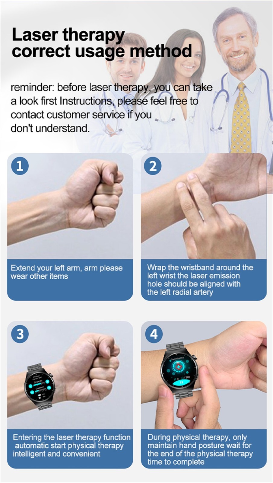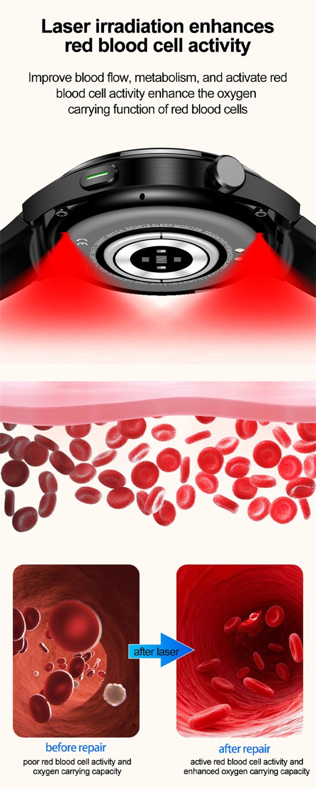 Special Features | 1.Laser physiotherapy+ call +lipid uric acid blood sugar high-end health management watch; 2.Laser therapy, non-invasive blood glucose measurement, uric acid measurement, blood lipid monitoring, blood pressure monitoring; 3. Female physiological health remote relatives and friends care function BT call; 4.The watch has the function of laser physiotherapy, optimize blood lipid blood glucose blood pressure, improve blood microcirculation, prevent cardiovascular and cerebrovascular diseases 5.blood glucose, blood lipid, uric acid, body temperature, blood pressure, blood oxygen, sleep and other monitoring, breathing training, all kinds of health functions are always concerned, for your all-weather health escort |