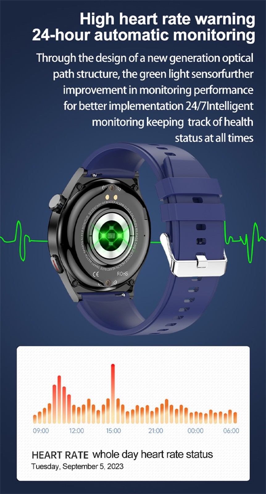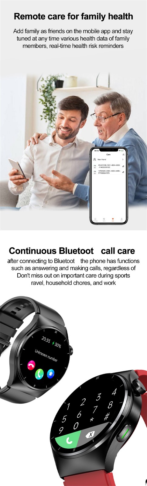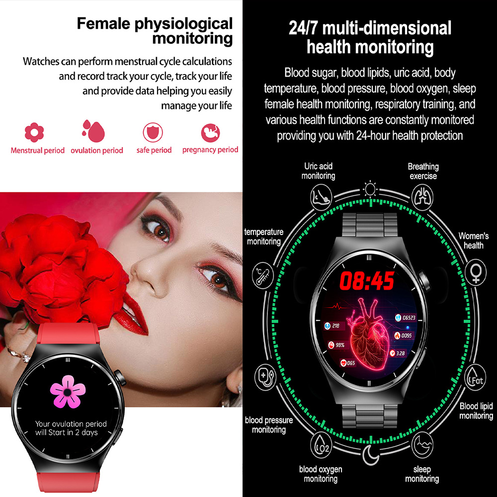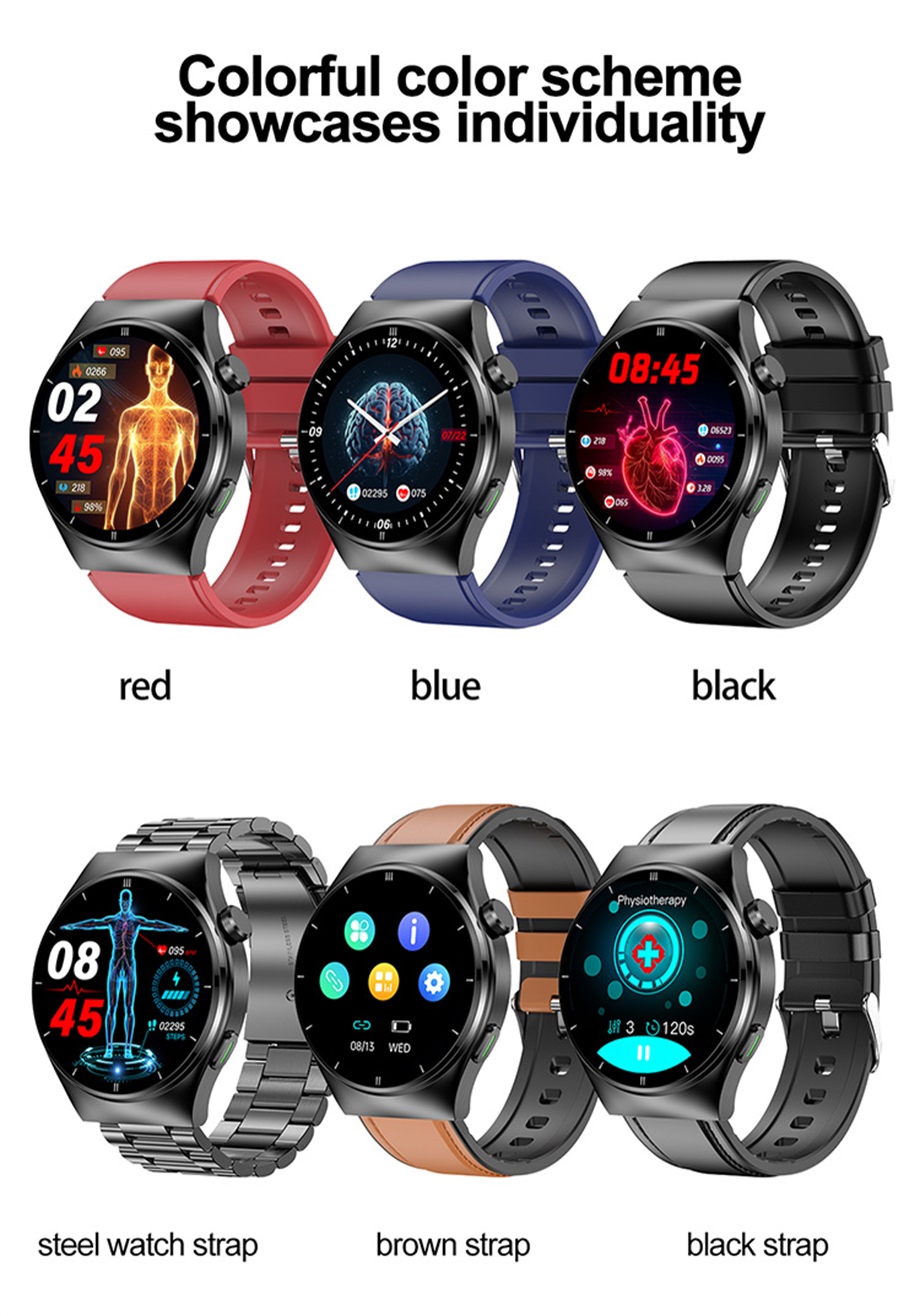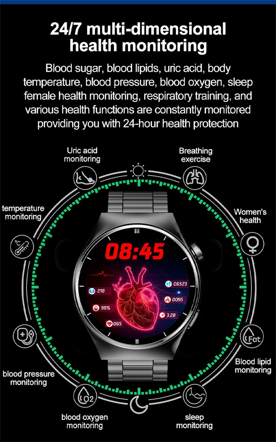 Special Features | 1.Laser physiotherapy+ call +lipid uric acid blood sugar high-end health management watch; 2.Laser therapy, non-invasive blood glucose measurement, uric acid measurement, blood lipid monitoring, blood pressure monitoring; 3. Female physiological health remote relatives and friends care function BT call; 4.The watch has the function of laser physiotherapy, optimize blood lipid blood glucose blood pressure, improve blood microcirculation, prevent cardiovascular and cerebrovascular diseases 5.blood glucose, blood lipid, uric acid, body temperature, blood pressure, blood oxygen, sleep and other monitoring, breathing training, all kinds of health functions are always concerned, for your all-weather health escort |
