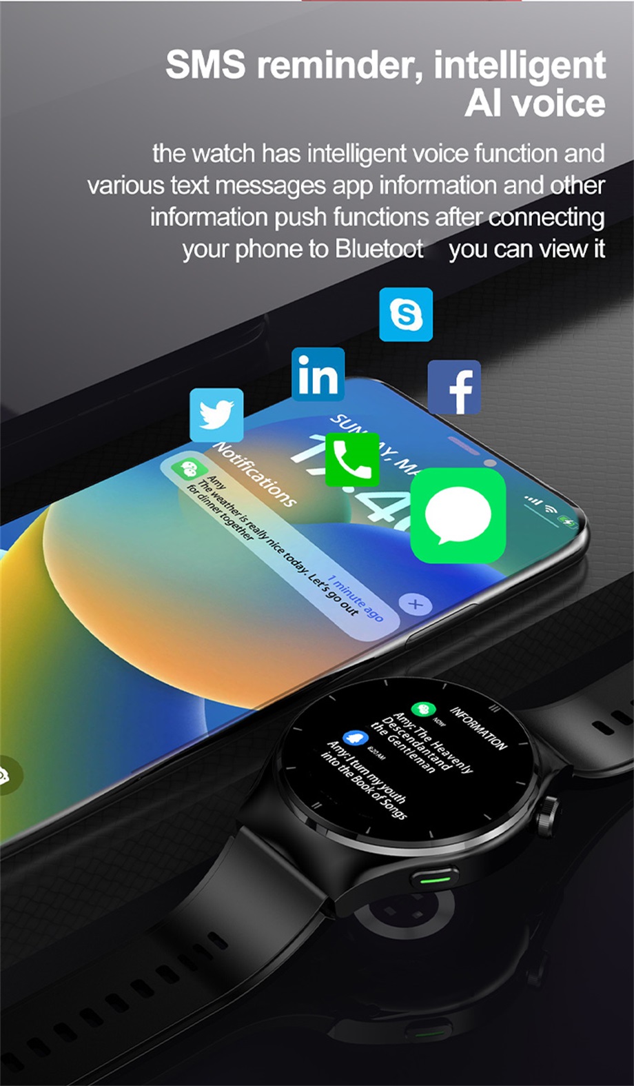 Function points | 1.Dual-probe laser health physiotherapy function, 2.BT call, SOS emergency call function, 3.non-invasive blood glucose measurement, uric acid measurement, blood lipid monitoring, HRV-AI diagnosis, remote relatives care function, female physiological health, Blood Pressure Monitoring, body temperature monitoring, blood oxygen monitoring, breathing training, heart rate monitoring, sleep monitoring, sedentary alerting and other health functions, 4. intelligent voice assistant, weather forecast, 5.1.91-inch retina high-resolution 320 x 386 screen. 6.Sports Functions: pedometer/Calorie/distance, multi-sport mode, music control, business card, calculator, calendar, multi-language. 7.App: HealthWear |